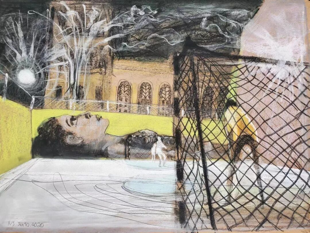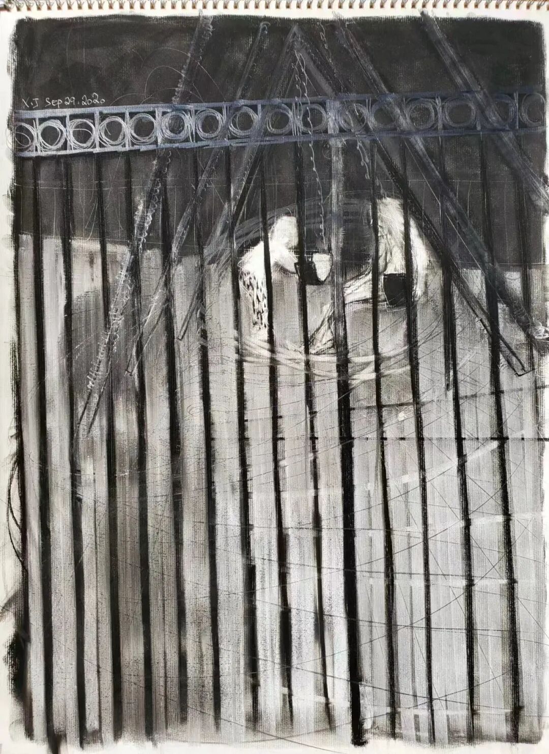 栅栏,61x46cm,2020,纸本色粉、炭精、木炭、铅笔