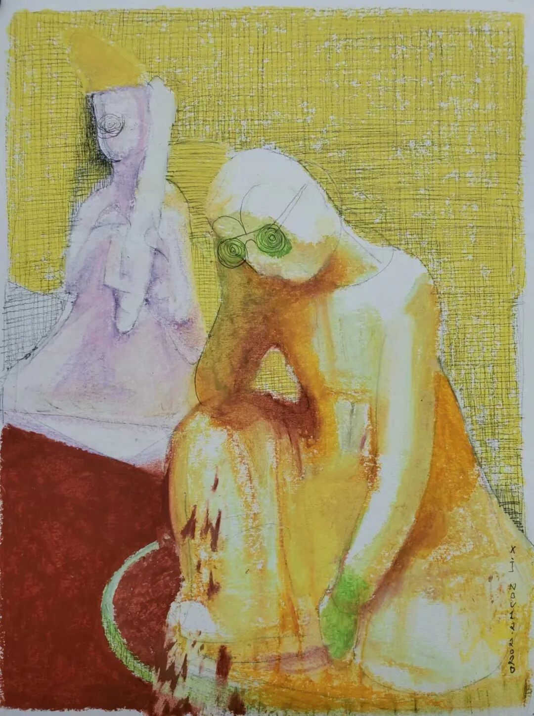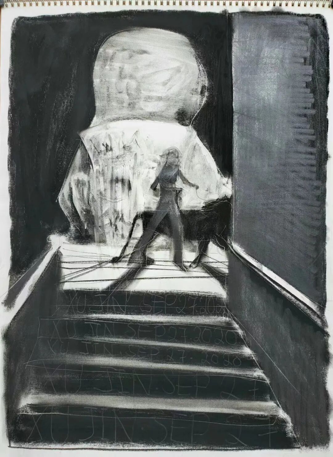 此时此刻,46x61cm,2020,纸本色粉、炭精、铅笔