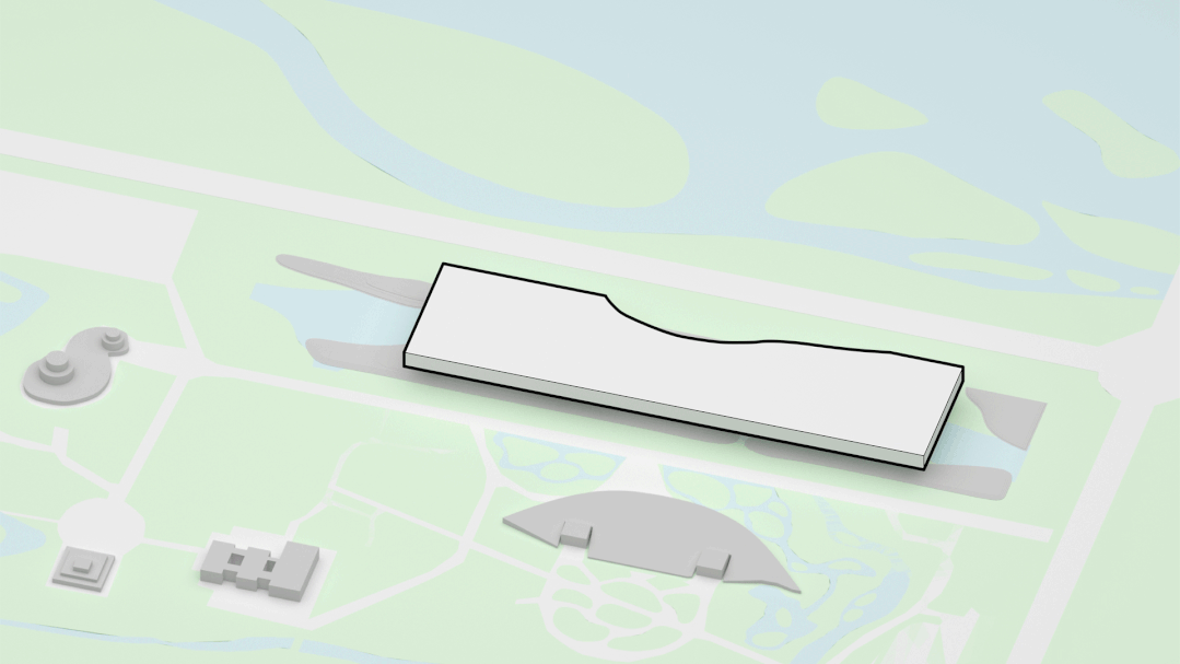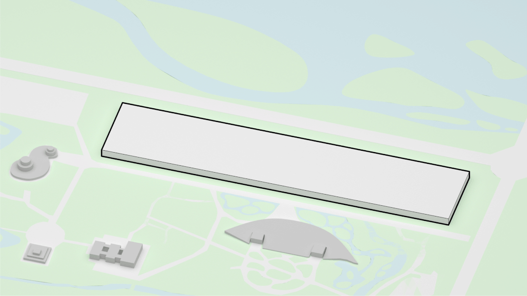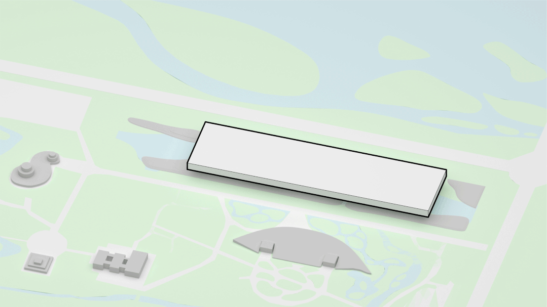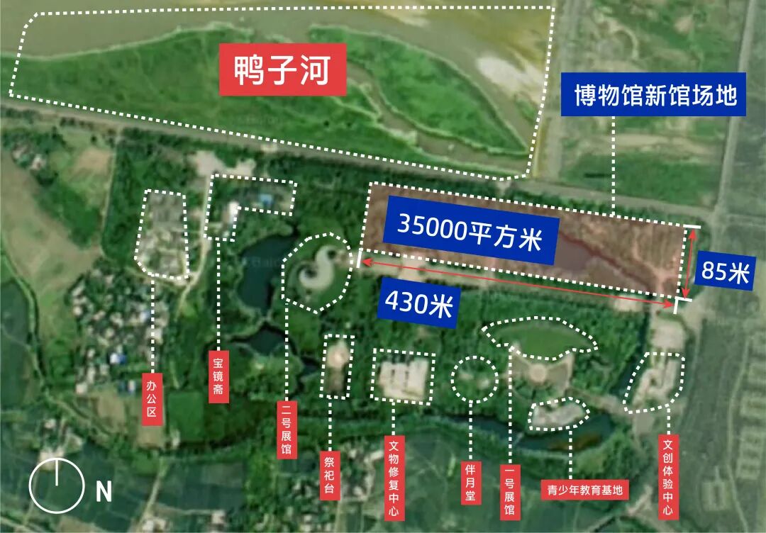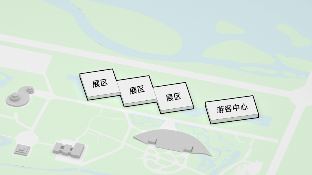 此次项目需要在三星堆博物馆东西方向的主轴线北面临鸭子河中门区域新建展馆。场地是一个长430米,宽85米的长方形,建筑面积约为35000平方米。