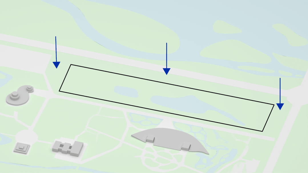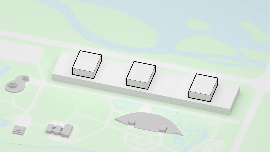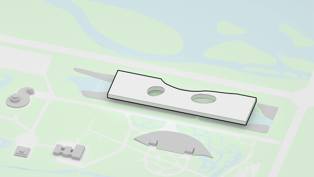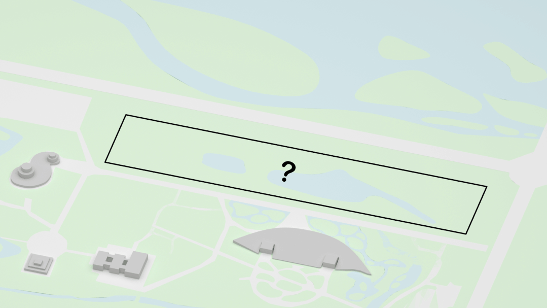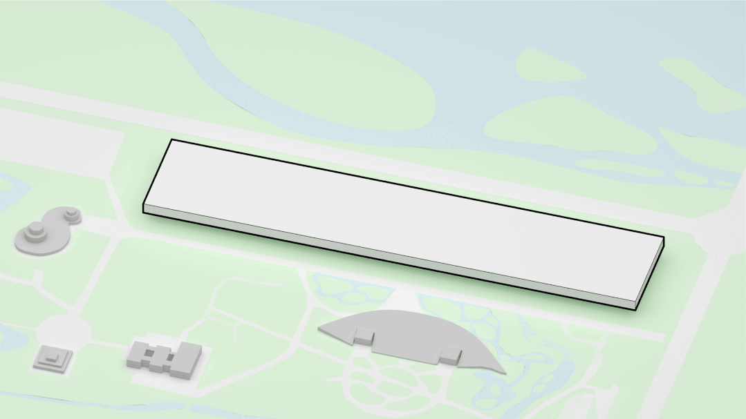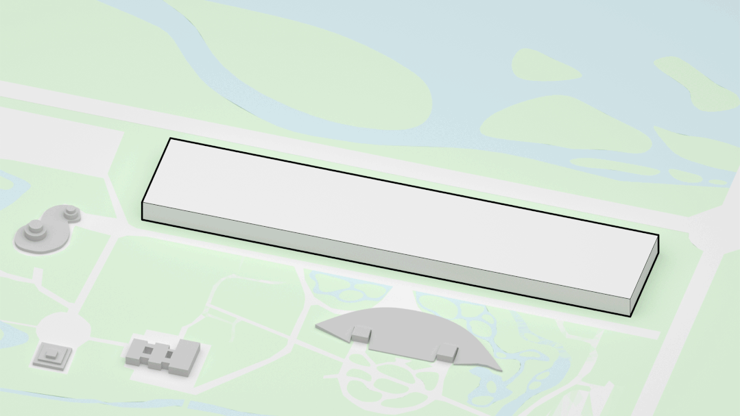 此次项目需要在三星堆博物馆东西方向的主轴线北面临鸭子河中门区域新建展馆。场地是一个长430米,宽85米的长方形,建筑面积约为35000平方米。