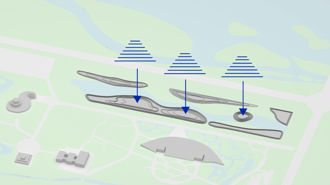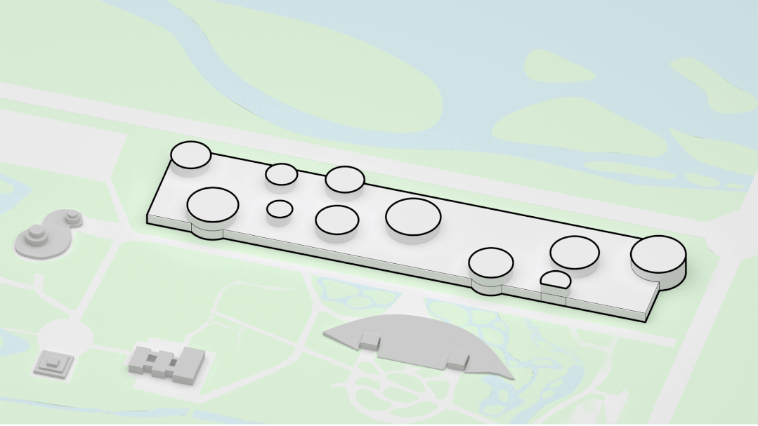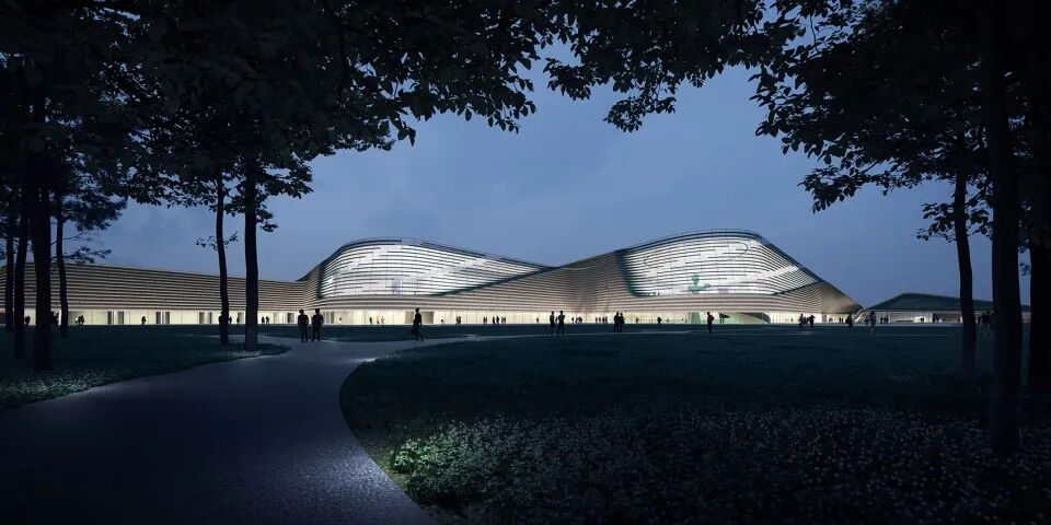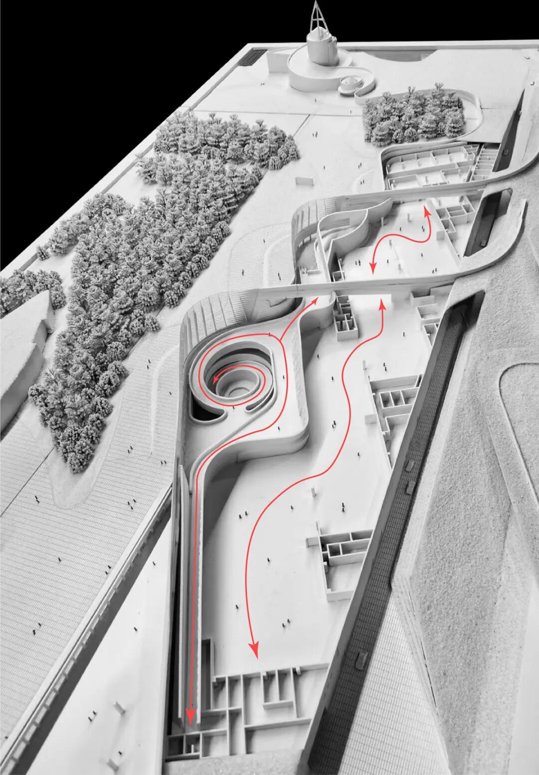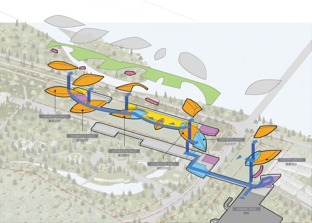 接着将2号馆经典的螺旋曲线外墙延续发展,作为三个堆体外形和空间的控制曲线。屋顶采用斜坡覆土形态,建筑消隐的融入场地,与对面1号馆的斜坡形体左右呼应。