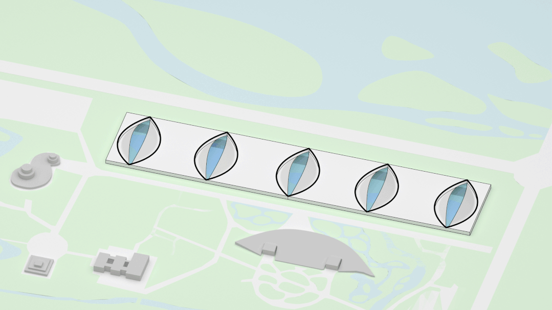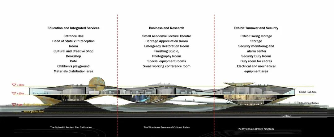 不仅满足了展厅内无柱的结构形式,还保护了湿地并抵御洪涝危害,并且其结构形式在人的尺度视角也还原出了青铜面具的眼部的曲线。