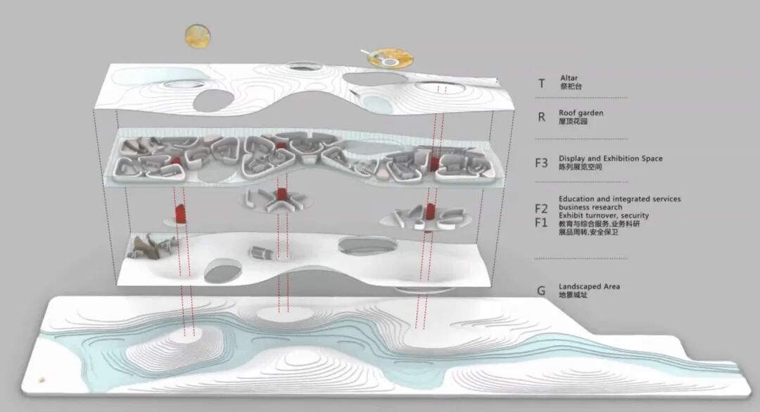 为了与建筑下部的结构语言向统一,屋顶也进行了同样的起伏设计,在3个承构筒的位置处进行抬高,和下方的地形形成呼应,并增加了屋顶祭祀台和屋顶花园,增强了空间的知识性、故事性、观赏性、趣味性,使游客的体验更上一层楼。