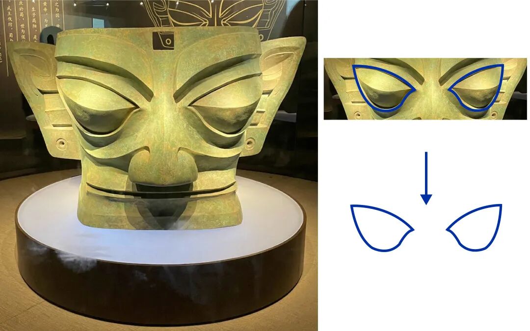 提到三星堆,最出名的文物应该就是这个青铜大面具了。作为三星堆宣传的重点,其夸张的眼部造型给无数人留下了深刻的印象,那我们就提取其眼部的曲线作为设计的关键元素。