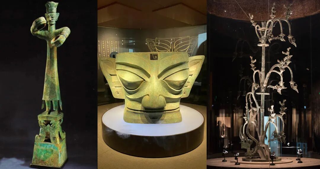 三星堆遗址出土文物数以万计,由金、铜、玉、石、象牙、海贝等大量精美文物、特殊文物以及成系列的陶器群组成。其中,高 2.62 米的青铜大立人、宽 1.38 米的青铜面具、高 3.96 米的青铜神树以及流光溢彩的金杖、满饰图案的边璋等,堪称稀世之珍。