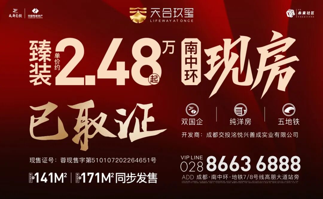 必须重点指出的是,天合玖玺是太平园片区城市生活5G创意城推出的第一个高端住宅项目,是武侯区三环内唯一的纯洋房社区和现房项目,一期2022年12月31日就可交房,买房到交房的时间仅仅一个月。
