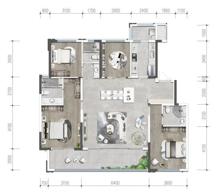 约63㎡的超大方厅,搭配约10米的超大景观阳台,带来IMAX的巨幕视野,客餐厅、中西双厨空间、景观阳台,加上北向的书房,整个空间融为一体,又可相对独立,形成丰富、多变的功能空间。