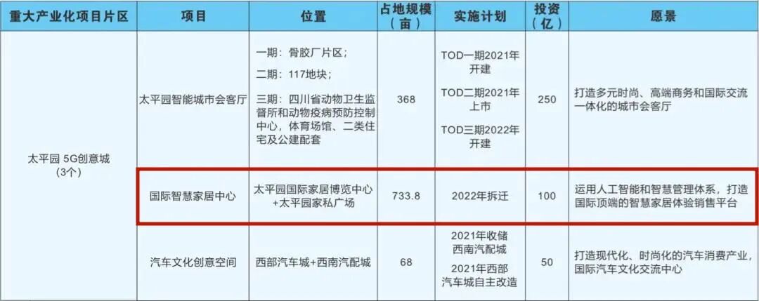 还有武侯区发布的三国创意园太平园5G创意城机会清单也显示,除太平园TOD的368亩用地外,计划实施搬迁、拆迁的还有太平园家私广场、红运汽配城、国际家居博览中心等,规模约733.8亩。