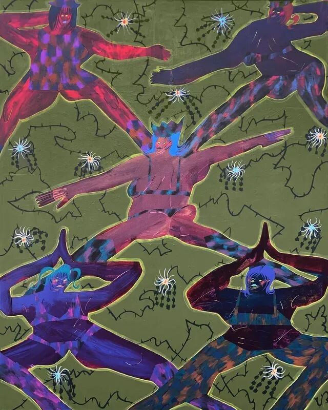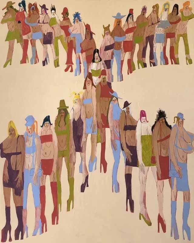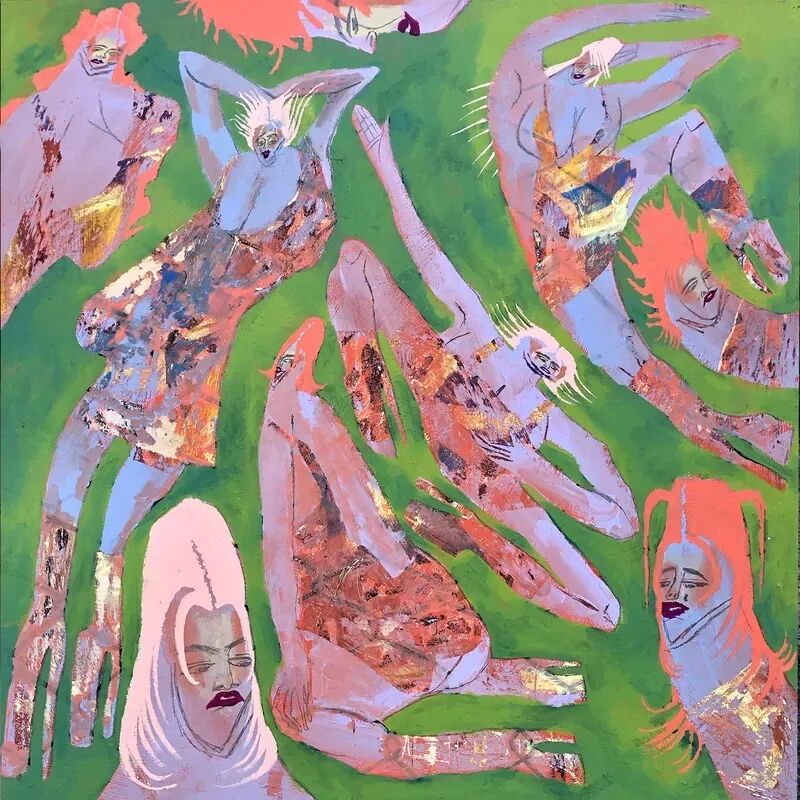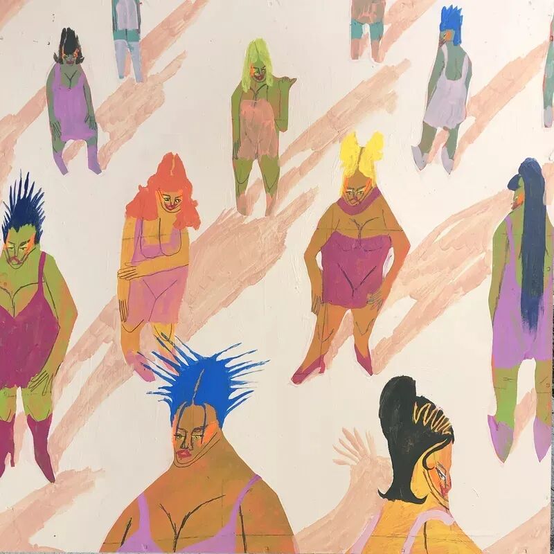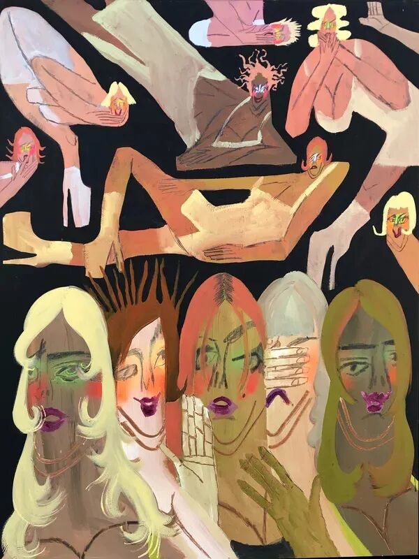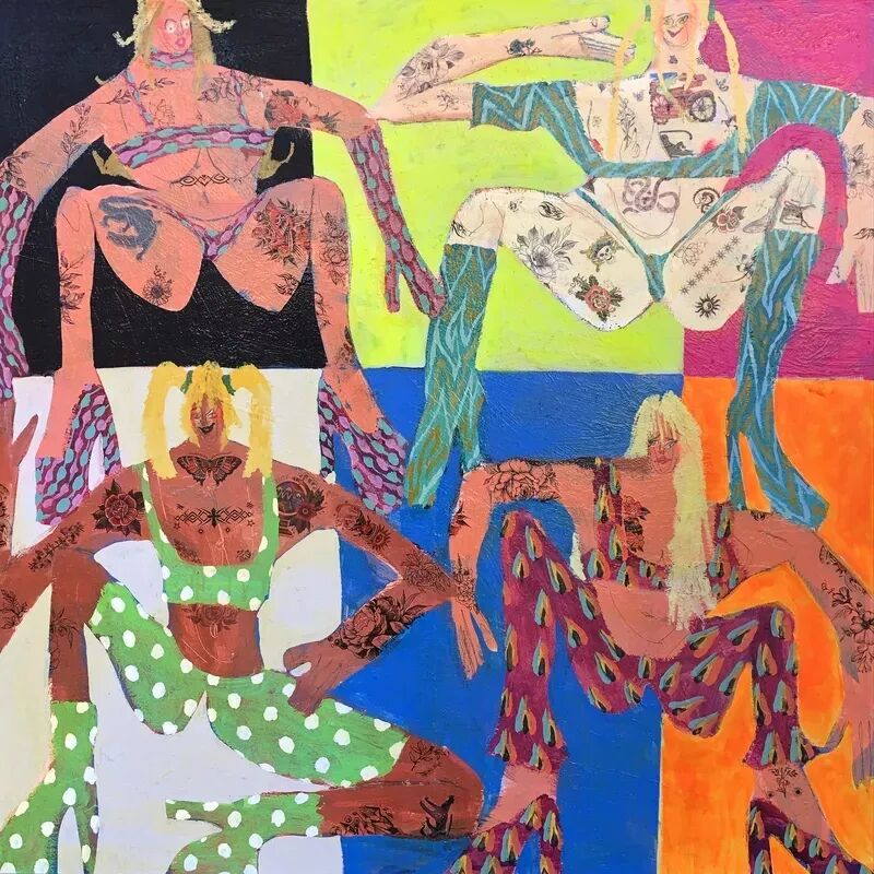 Acrylic , oil pastels, and temporary tattoos on canvas
