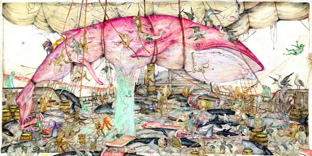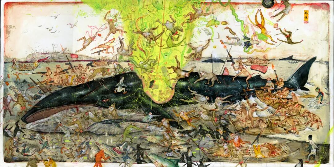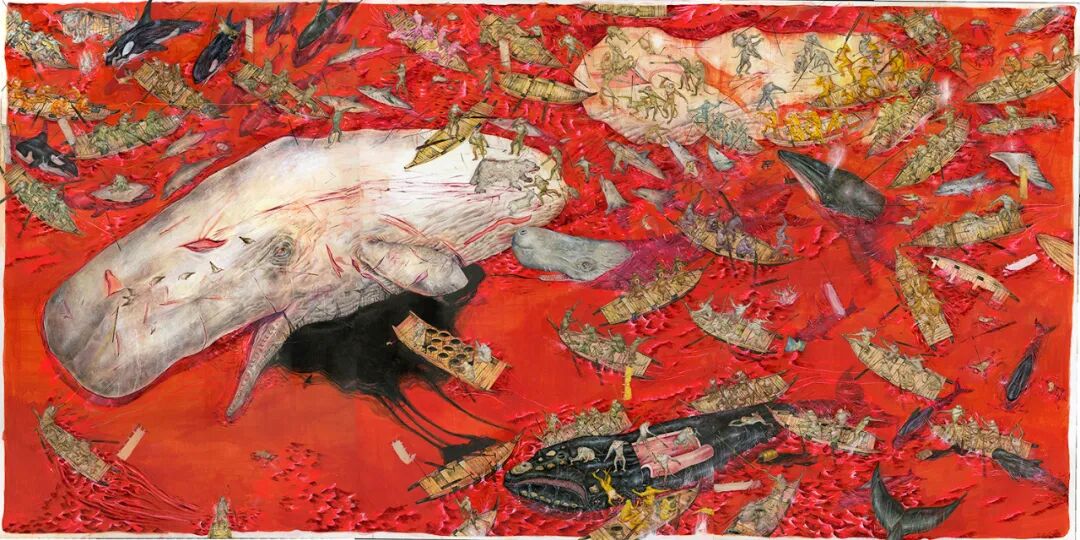 Whale Explosion, 24″ x 48″ acrylic on wood, 2018