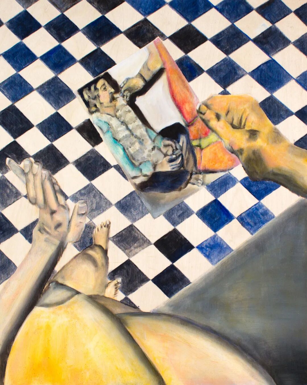 drawing holding a photograph,36 x 24 inches,Oil on canvas