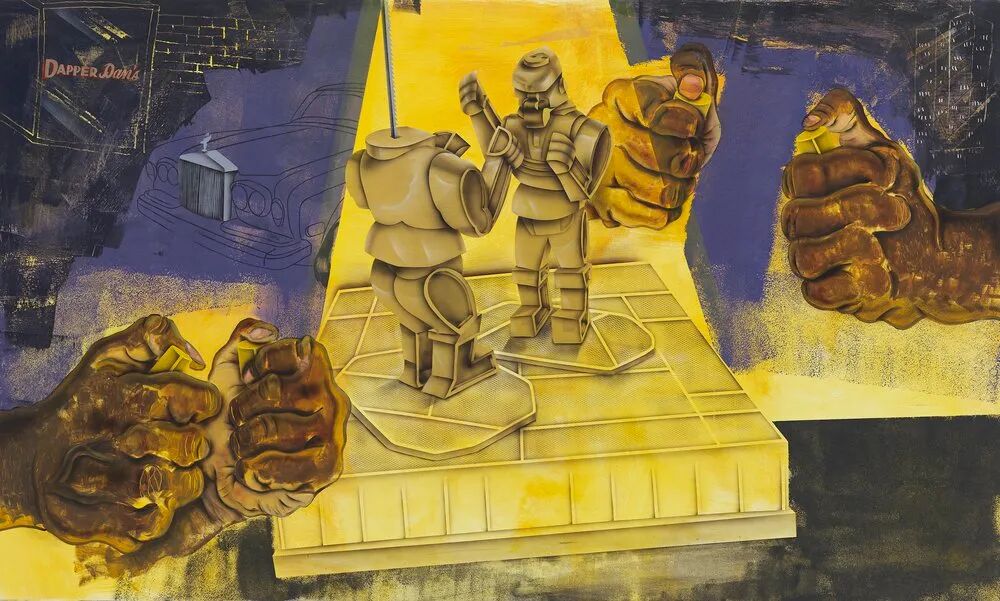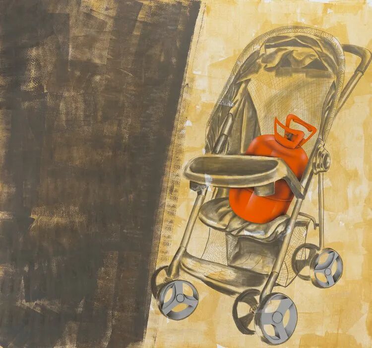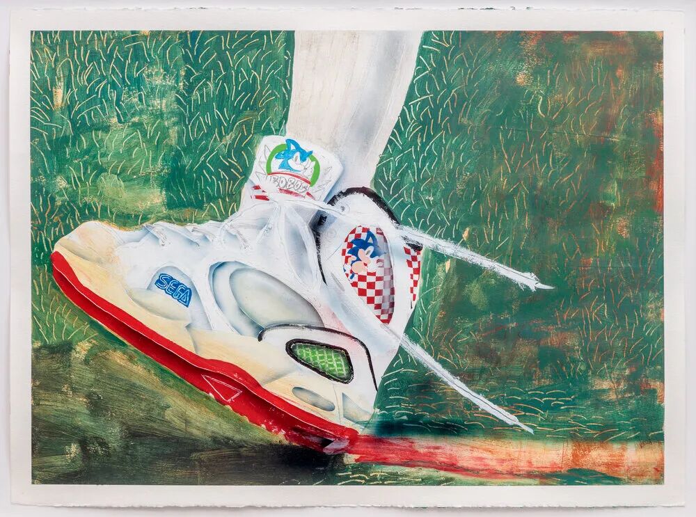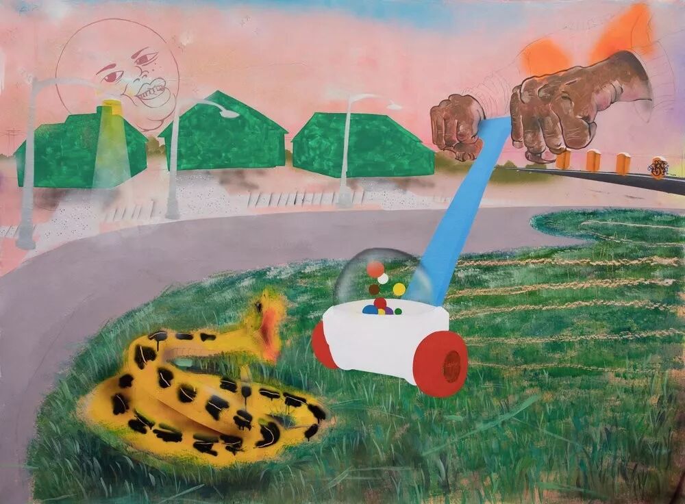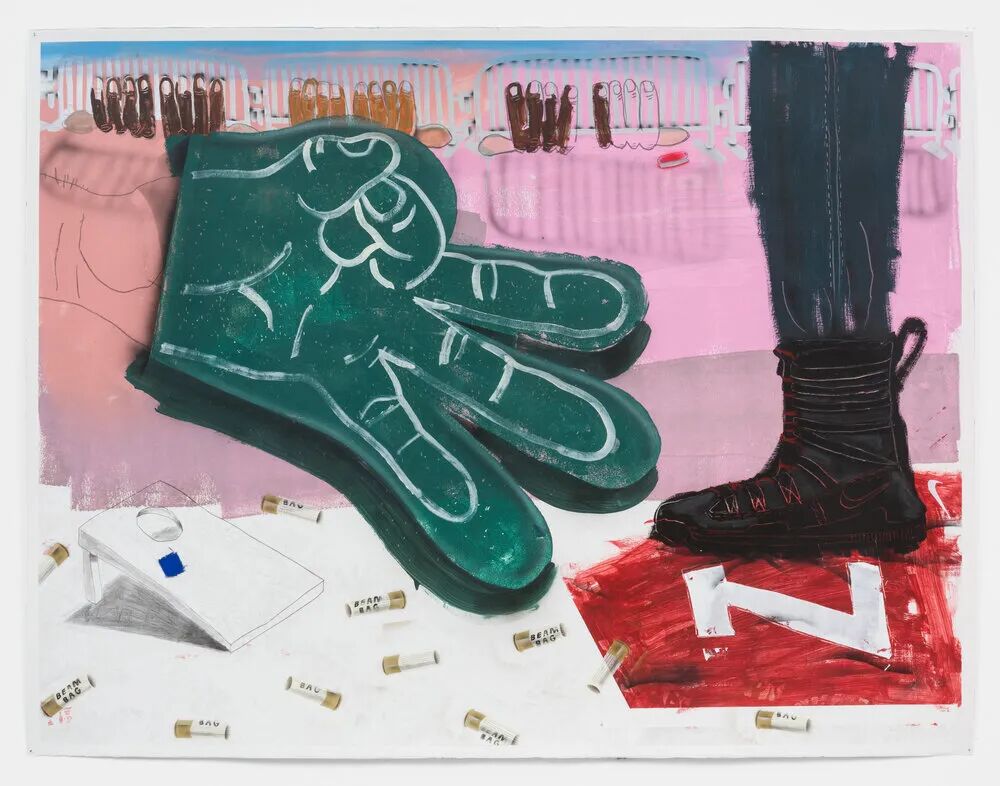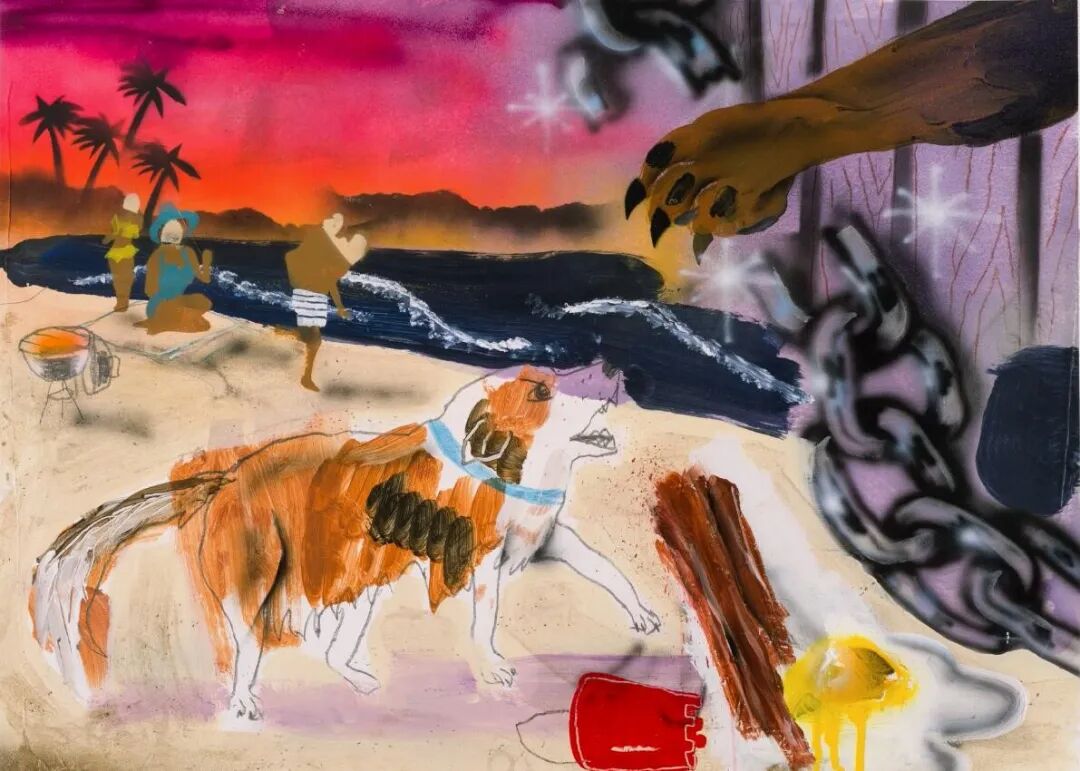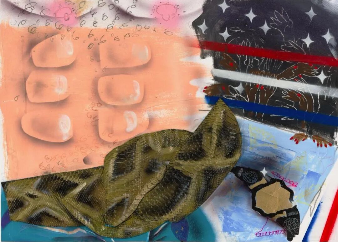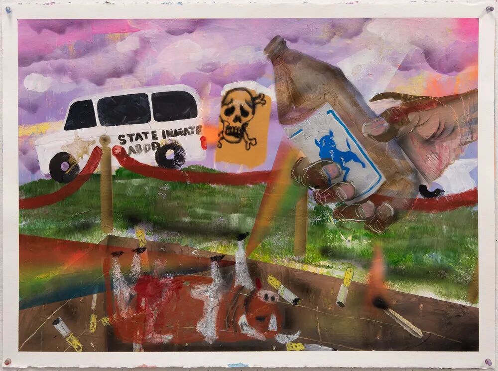 Acrylic, pencil, vinyl fabric, airbrush, aerosol paint on paper