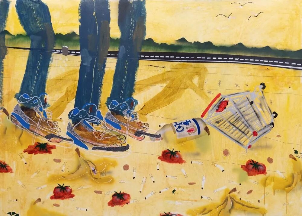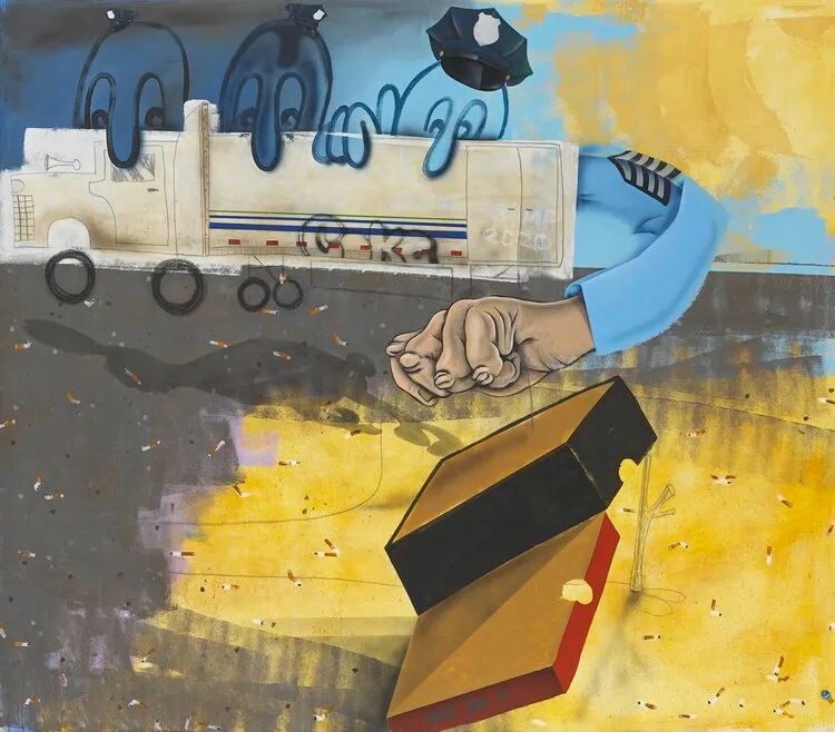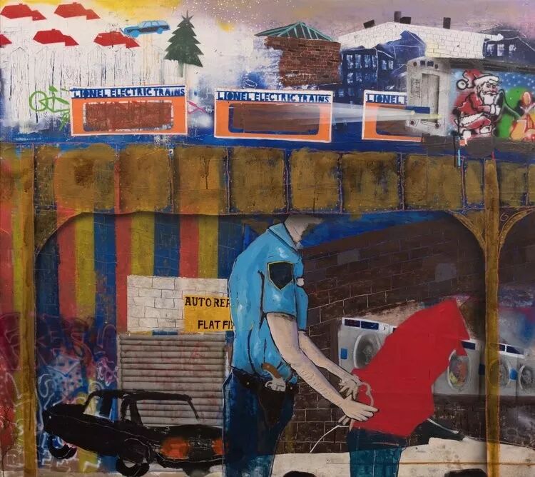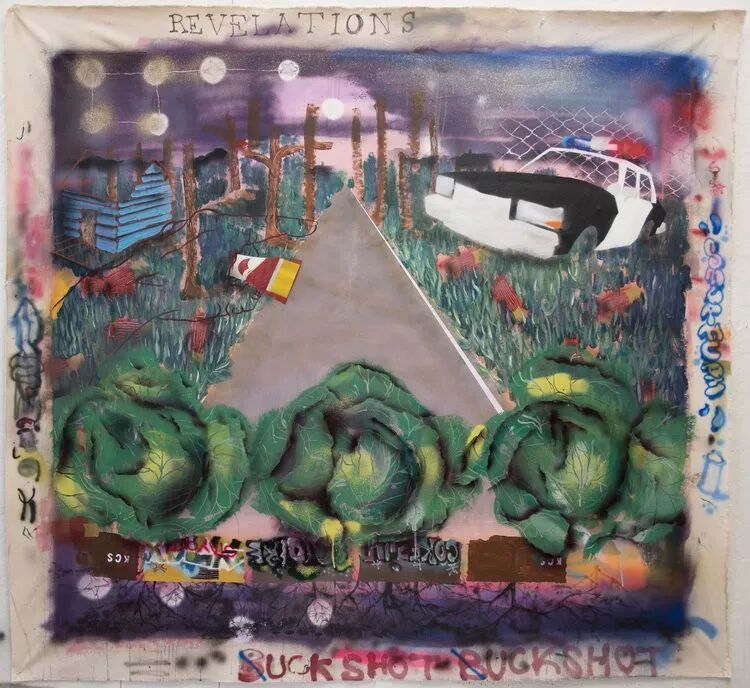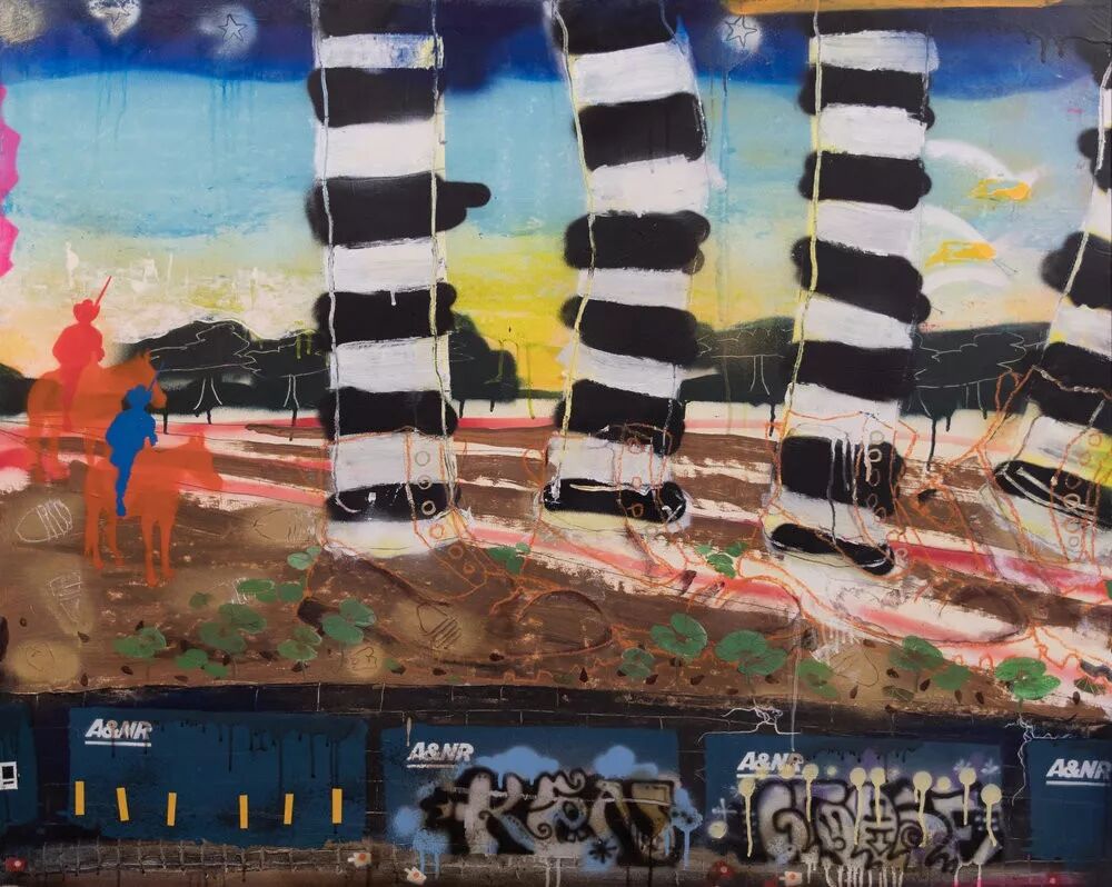 Acrylic, pencil, oil pastel, airbrush, aerosol paint on canvas