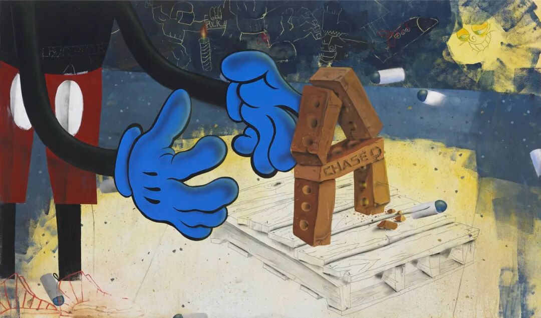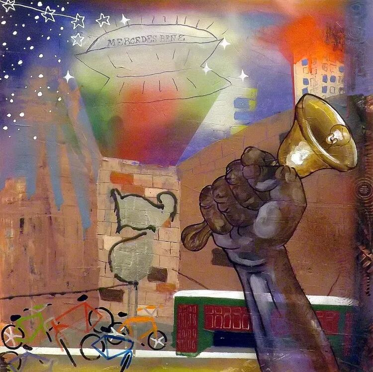 Acrylic, pencil, airbrush, aerosol paint on canvas