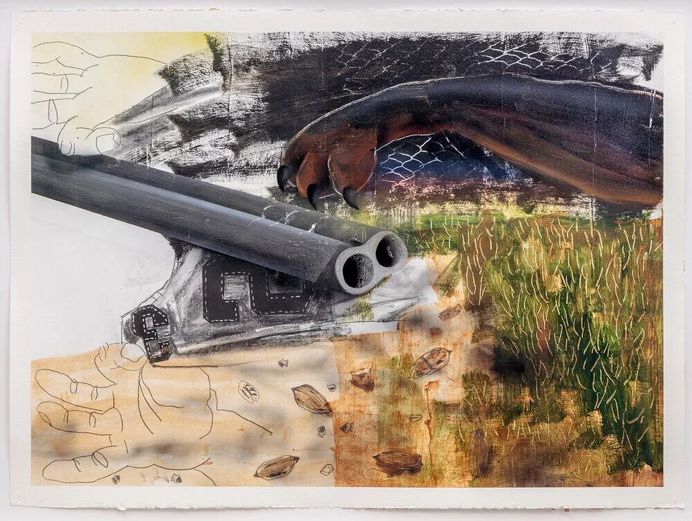Acrylic, pencil, vinyl, fabric, aerosol paint on paper
