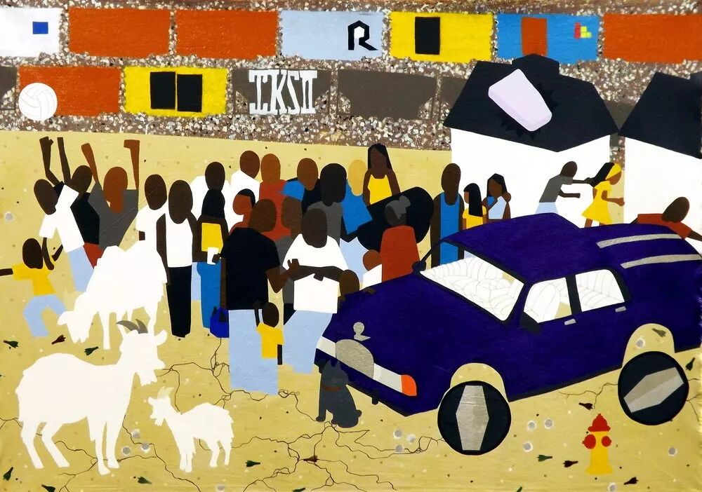 Acrylic, oil pastel, reflective glass beads, string, airbrush, aerosol paint on canvas