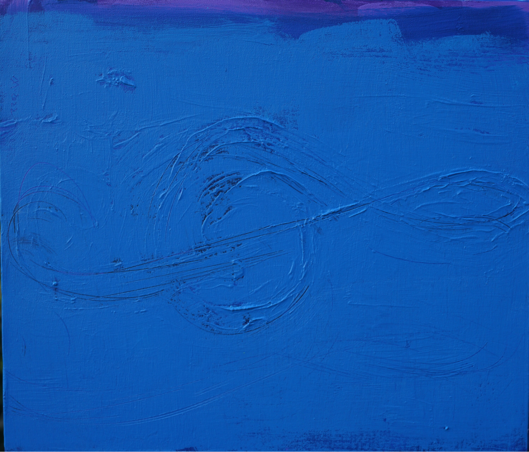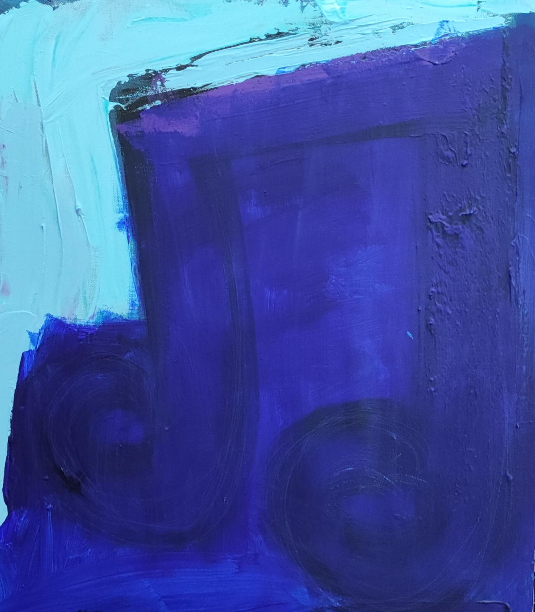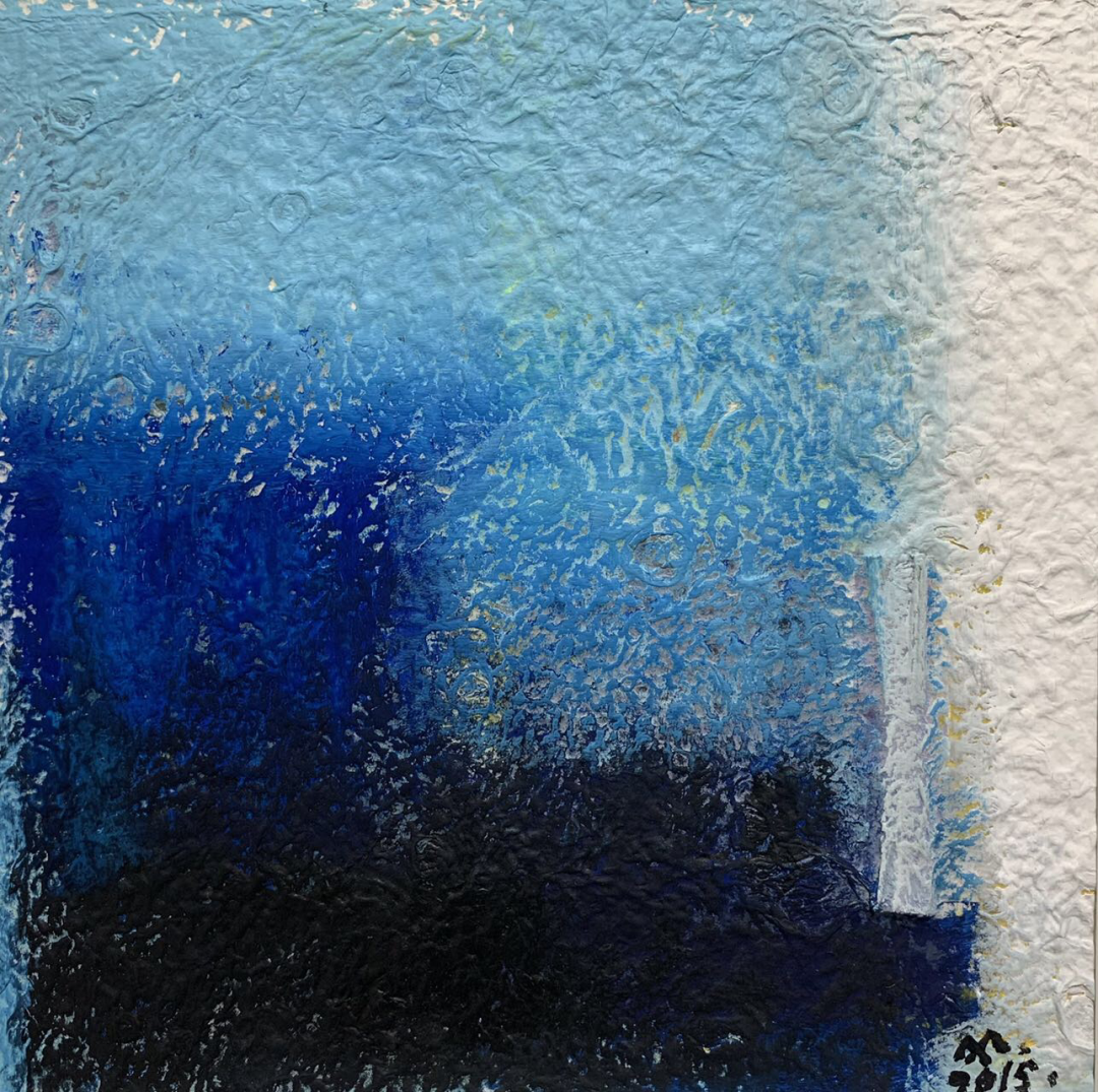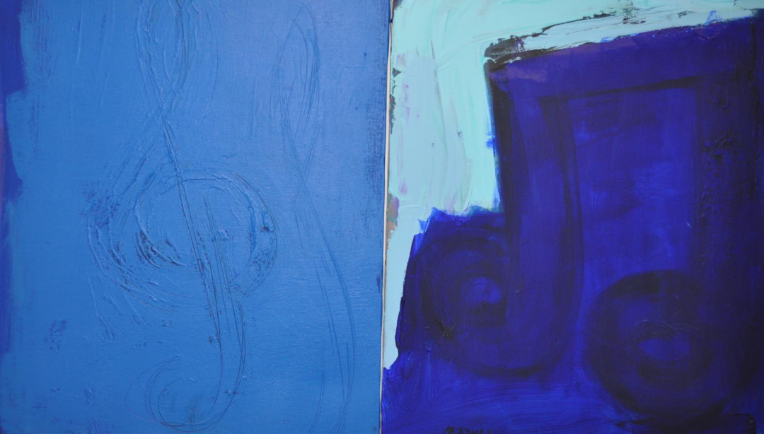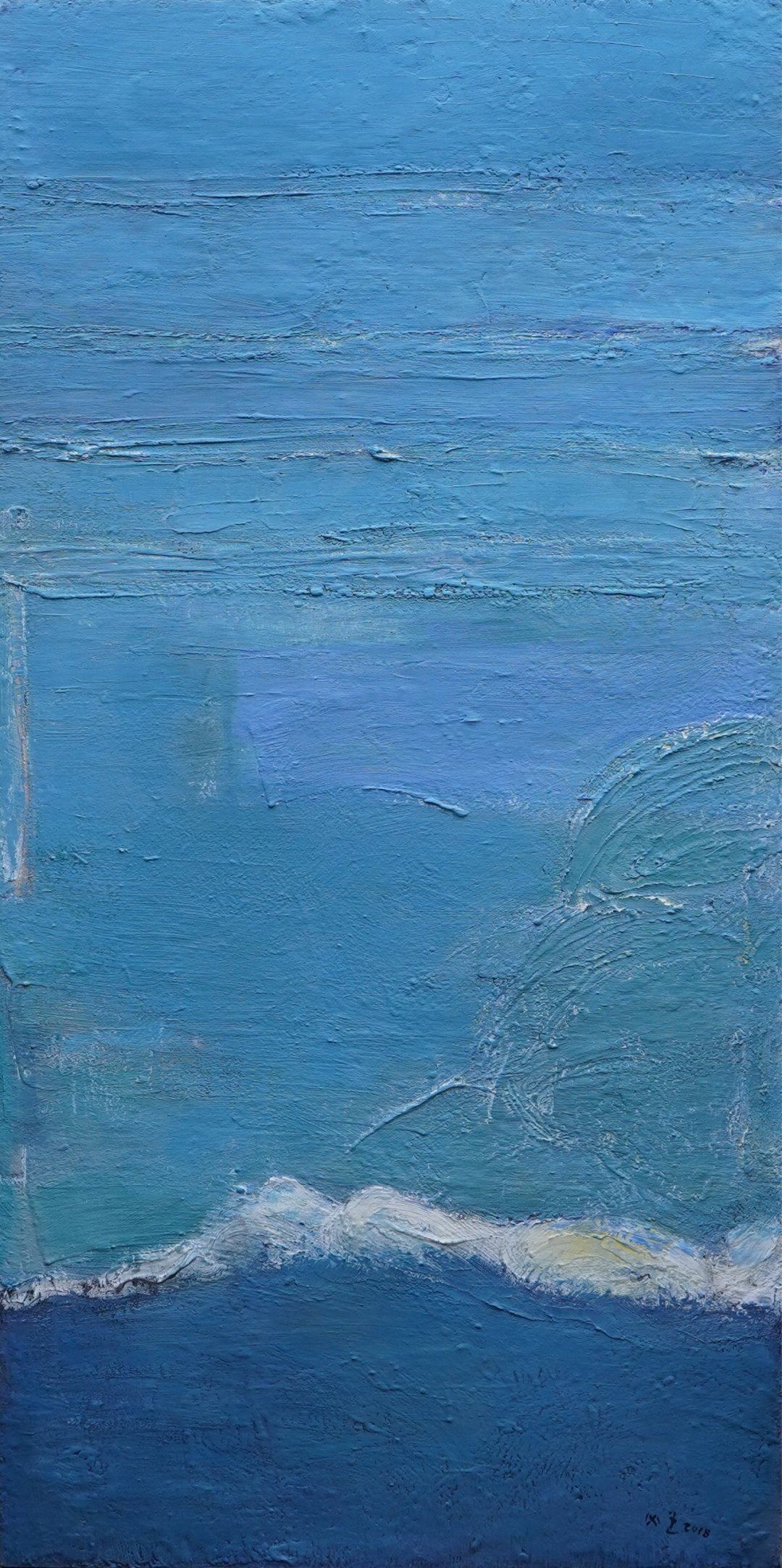 她继续抽象画探索,并且依然是以音乐为主题,但是她的画面发生了很大变化,以前那种有节奏韵律的“有机”的方块符号消失了,代之以更加虚幻无形的“无机”世界。尽管如此,但我觉得她的画更贴近她的内心,贴近人的起伏不定的情感。我非常高兴她的这一转变。