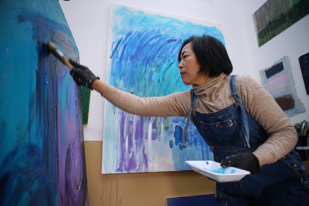 在「海之彼方」系列中的海、海岸皆出自法国的尼斯海。据说她钟爱尼斯海的平稳舒缓。画在中厚的手工和纸上的五幅大作分别呈现了从早到晚的尼斯海的一天的表情变化。透过画面观者可以窥视到艺术家的心像与从早到晚的大海的重叠。