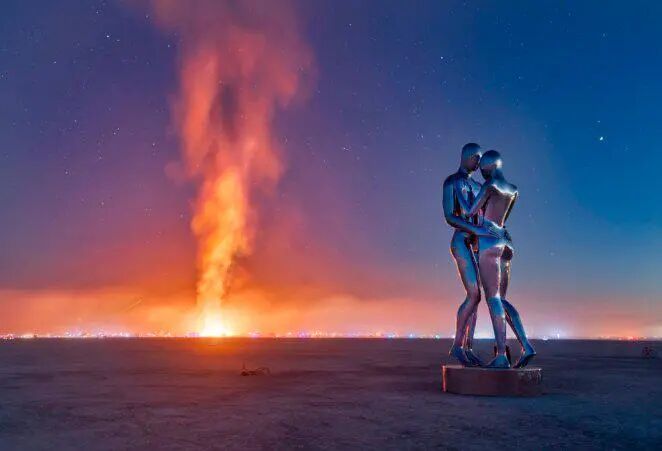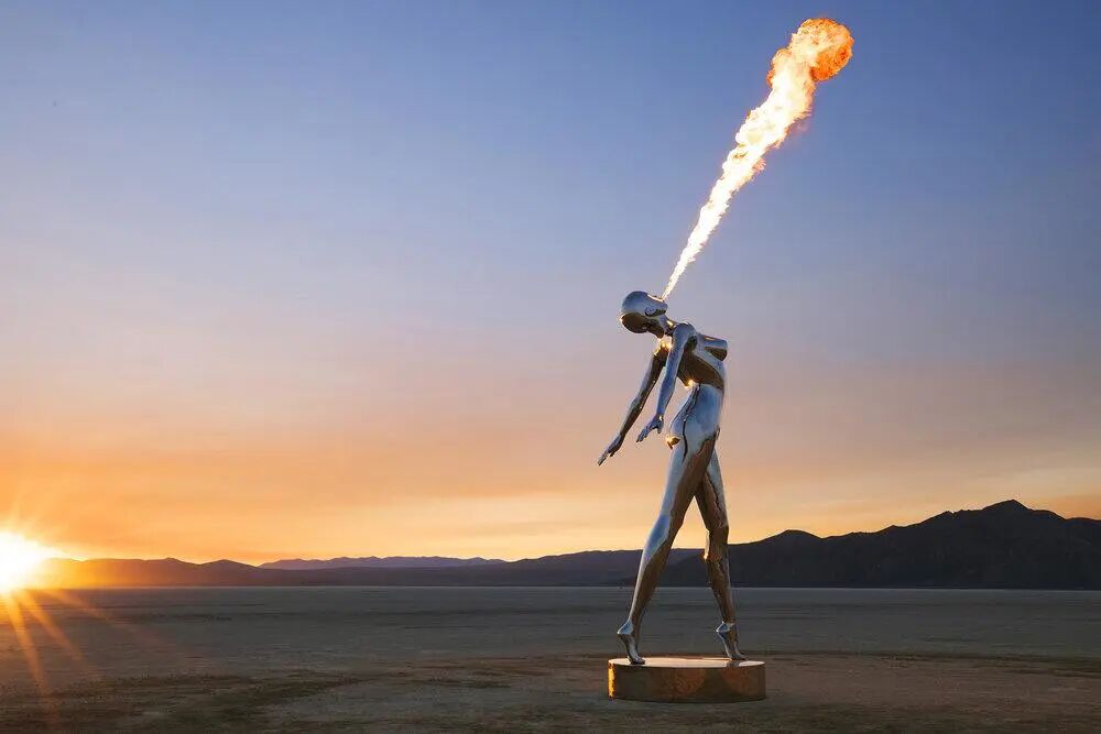 迈克尔·贝尼斯蒂的雕塑作品使用的材料也非常特别,类似金色的材料和闪亮的金属,让每一个雕塑人物都散发出美丽的光芒和光泽,呈现出了符合美学的赏心悦目。除了会发光之外,这位有想法的艺术家还让他的雕塑作品展现了喷火的技能,为旁观者创造了令人惊叹的视觉效果。当然,这种喷火的效果是艺术家根据真实存在的雕塑的原生3D渲染创建的。
