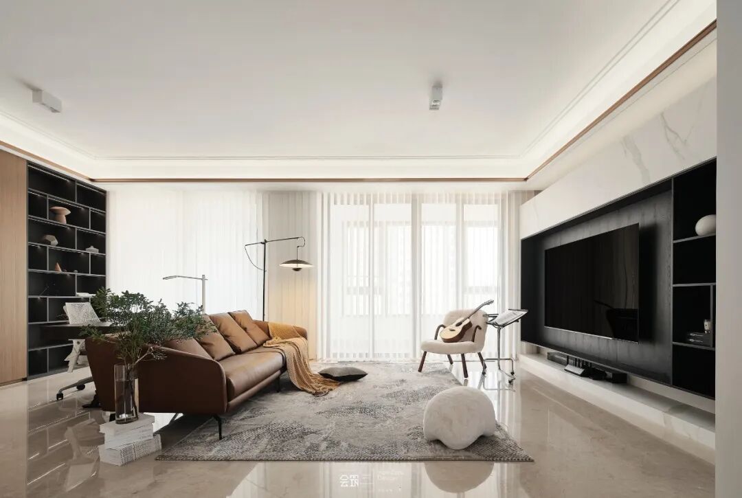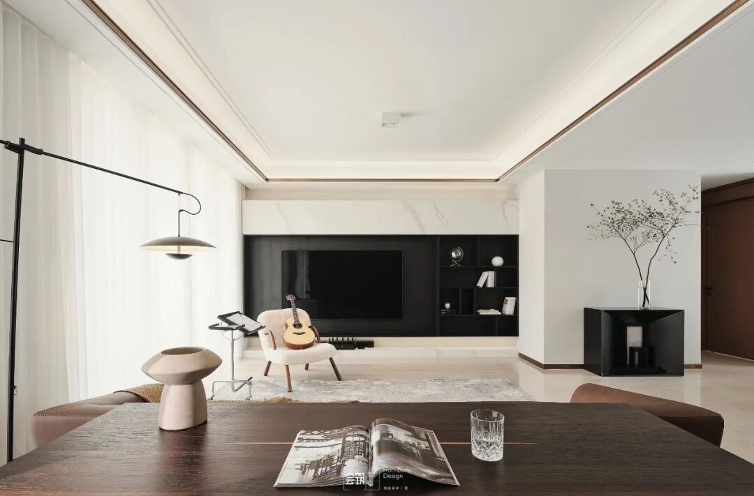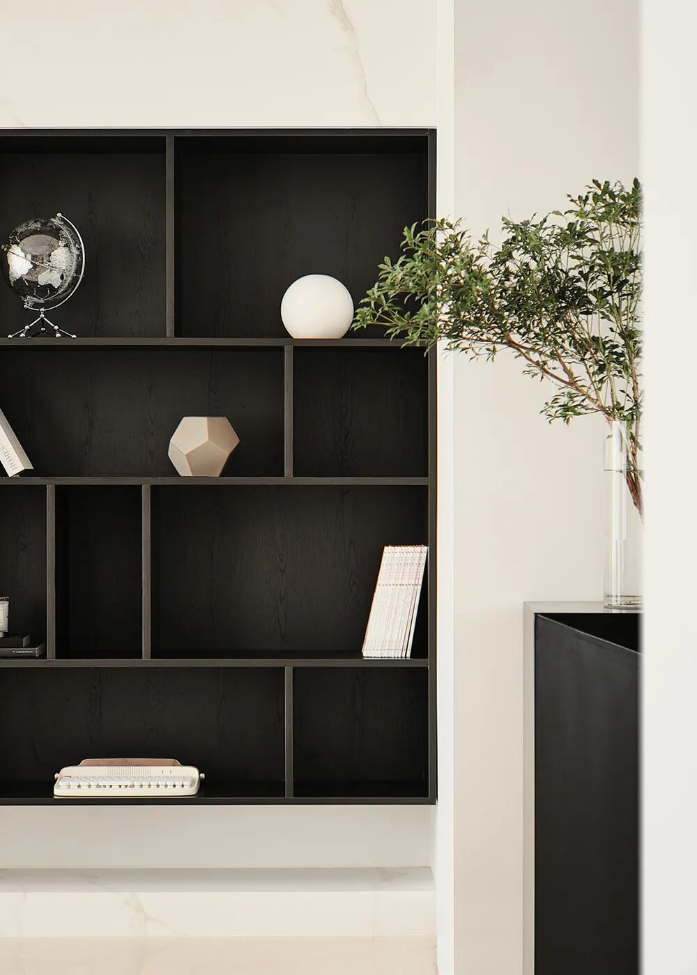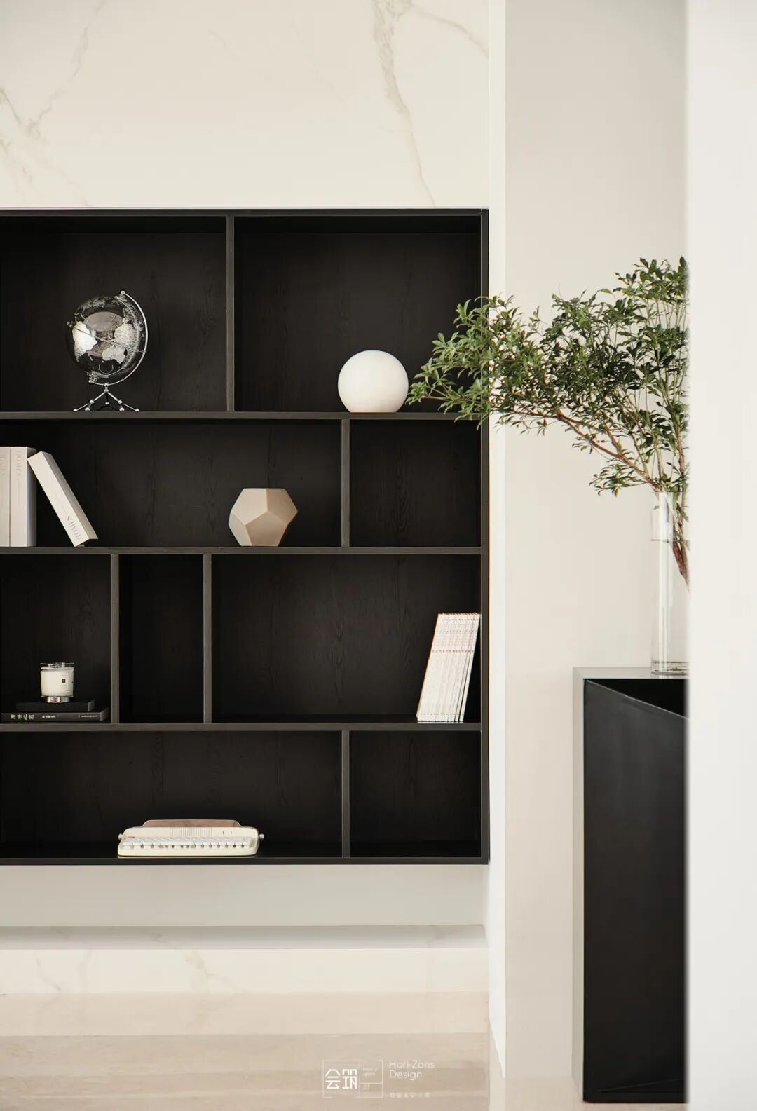 正对入户门的墙面,一组黑色成品装饰柜,立体感十足的造型让入户第一眼充满透视的艺术感,黑白对比的运用与客厅电视柜协调统一,简洁的色彩恰好让绿植在空间中更具表现力和生机。电视背景墙以黑色的木质纹理搭配白色石材,上下挑空做悬浮式壁柜,加上柔和的暗藏光源,让整个电视柜呈现轻盈简约的效果。