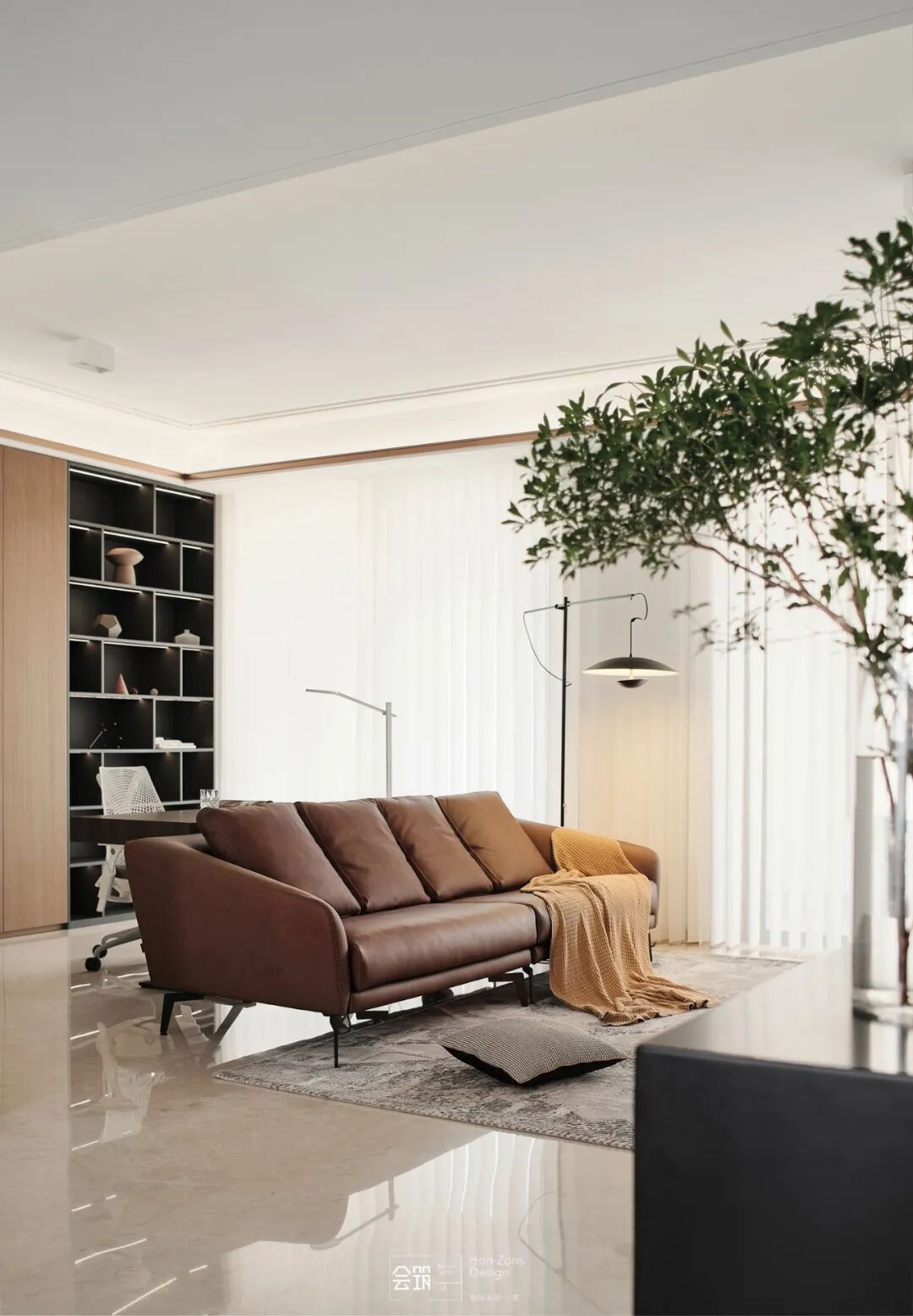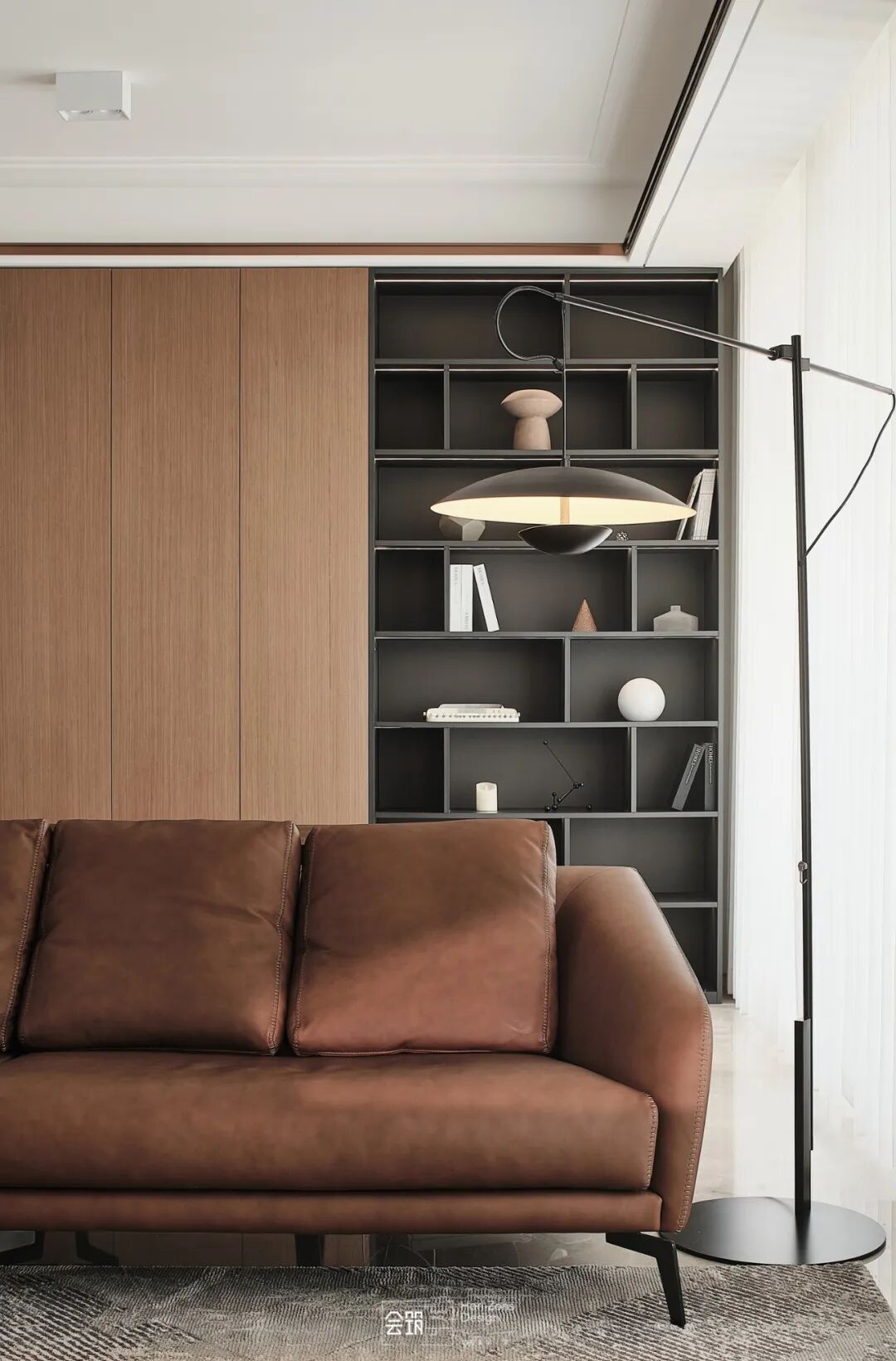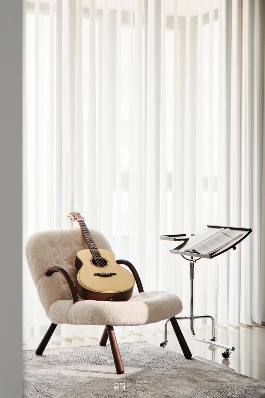 开放式书房背景墙利用原本墙面折角空间的距离,刚好定制一排书柜,次卧门顺势外拓,与书柜统一材质打造一体式隐藏门,保证背景墙的完整性。皮质沙发搭配羊羔绒小白椅,精心挑选的落地灯散发出柔和的灯光,空间中满满都是温柔的氛围。一把暖融融的羊羔绒小白椅,一架可以自由移动的琴谱架,搭建一个自由的角落,调配出生活不同的情调。