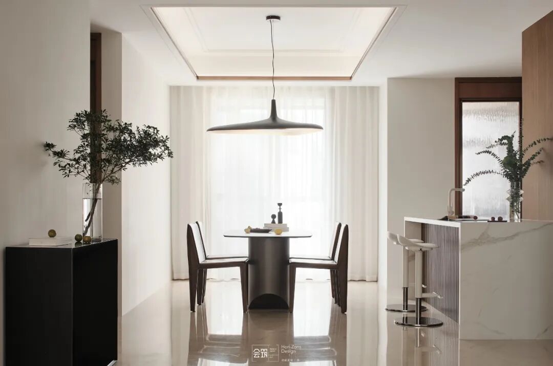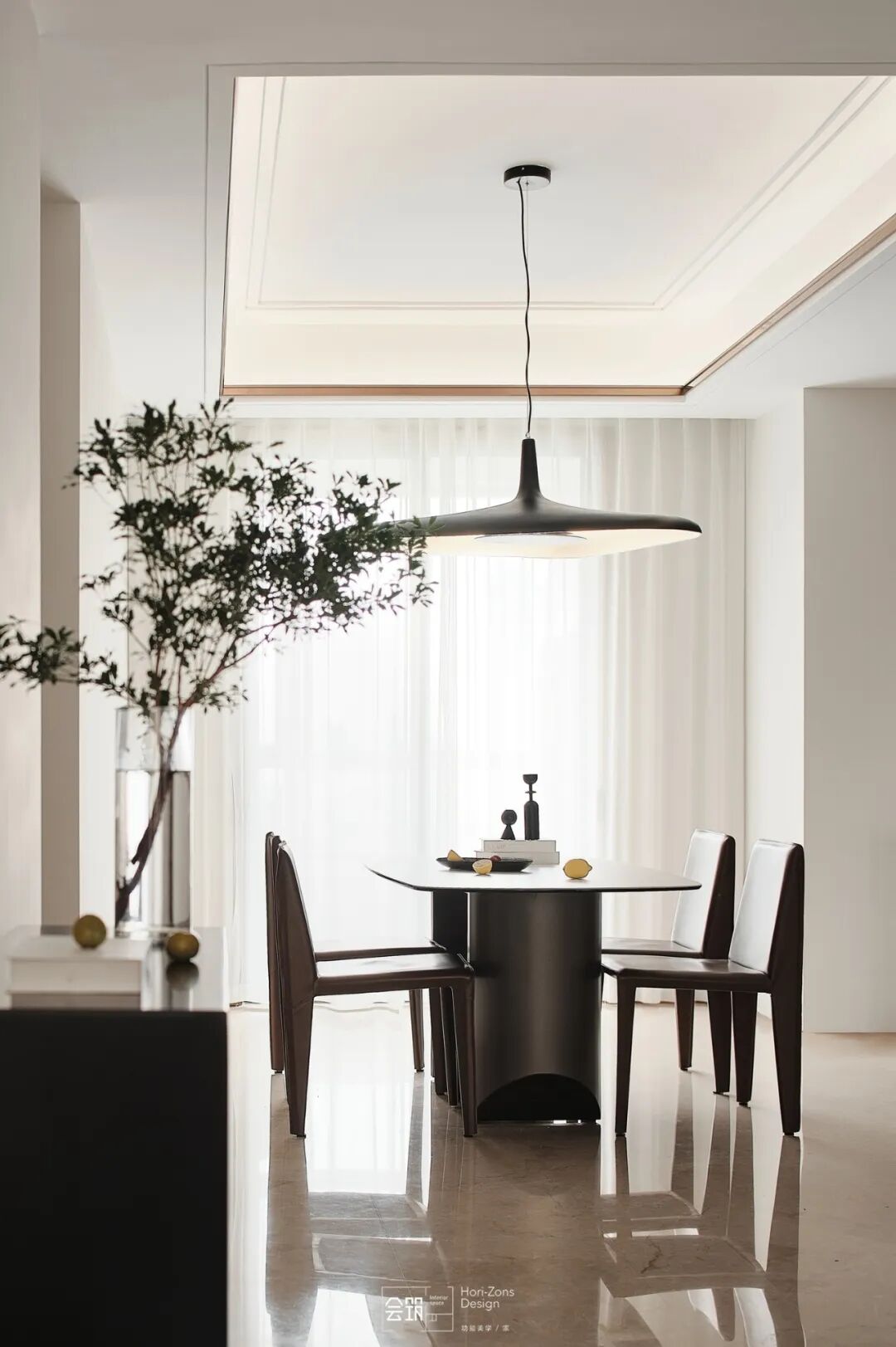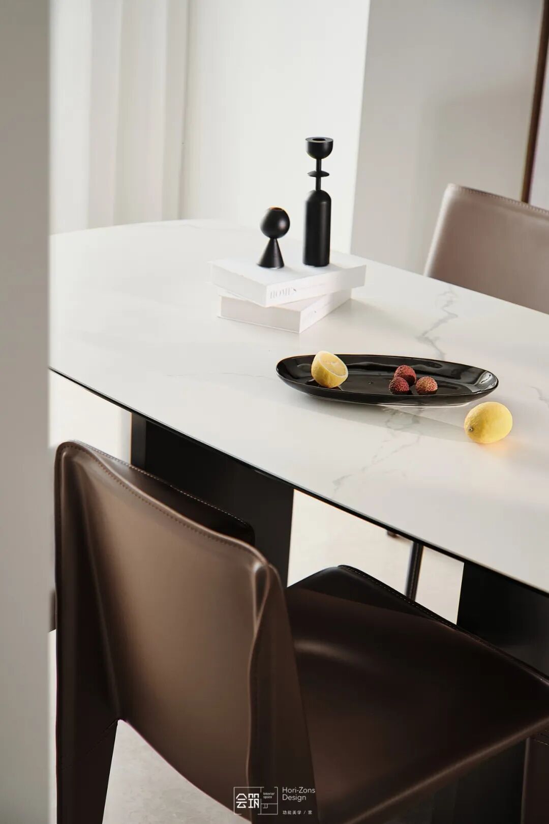 西厨区整面高柜系统,集成冰箱、蒸烤箱等,补充中厨的收纳。长虹玻璃门隔离中厨的重油烟,也保证西厨操作区的自然采光。家既要有高级感,也要有烟火气。餐厅吊灯兼具艺术与功能的平衡,打破了原本规则的对称,将设计的个性和美感融入家居空间。潘多拉奢石餐桌搭配挺阔的马鞍皮餐椅,没有多余修饰的简洁设计,赋予餐厅简约大气的质感,带来不流俗的个性格调。