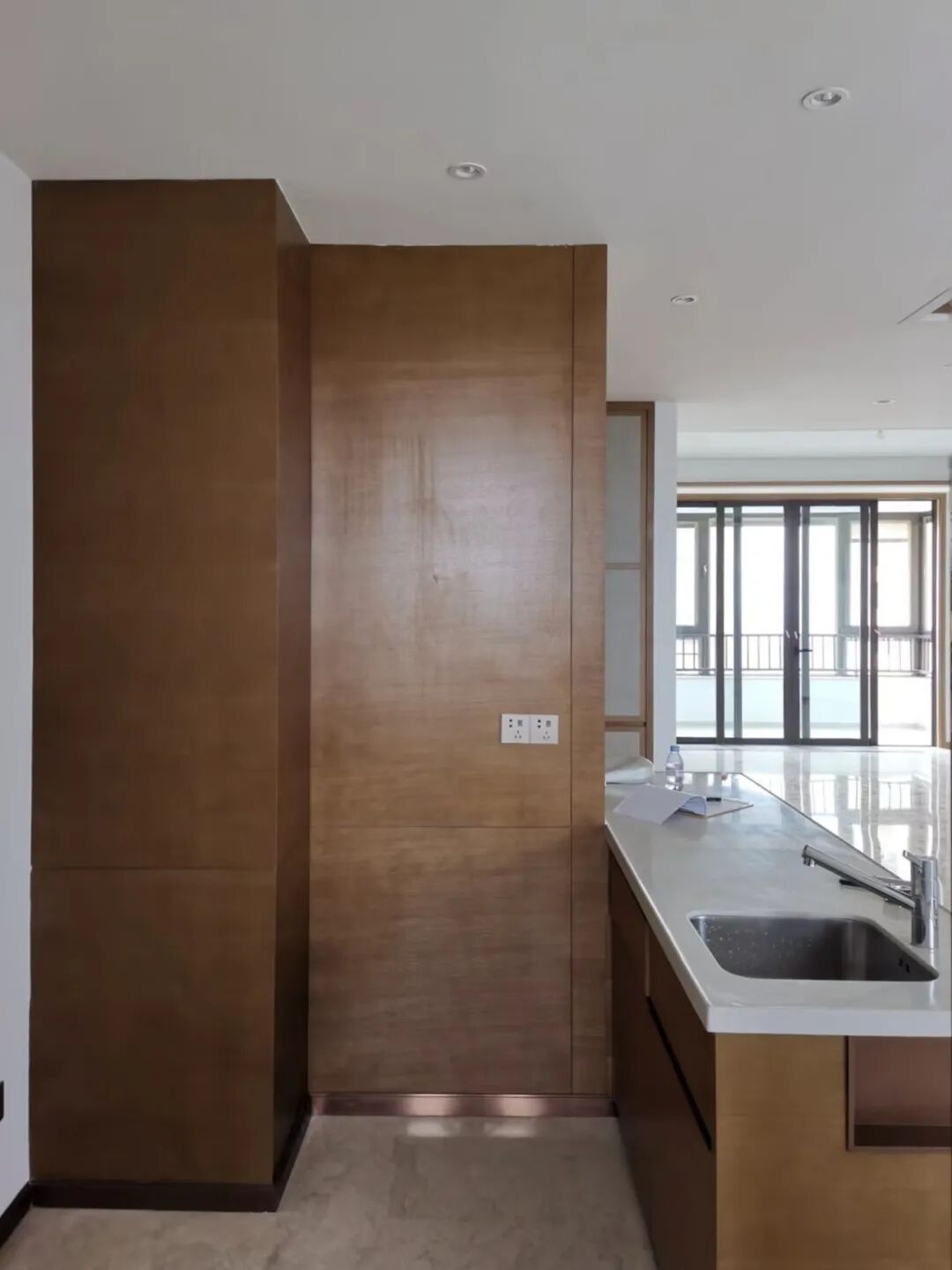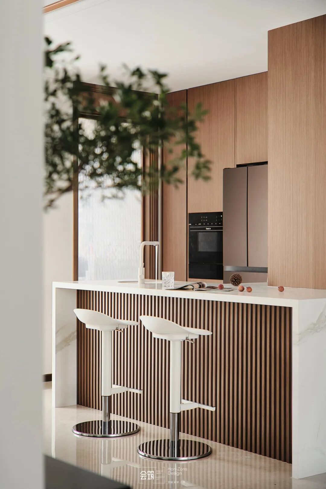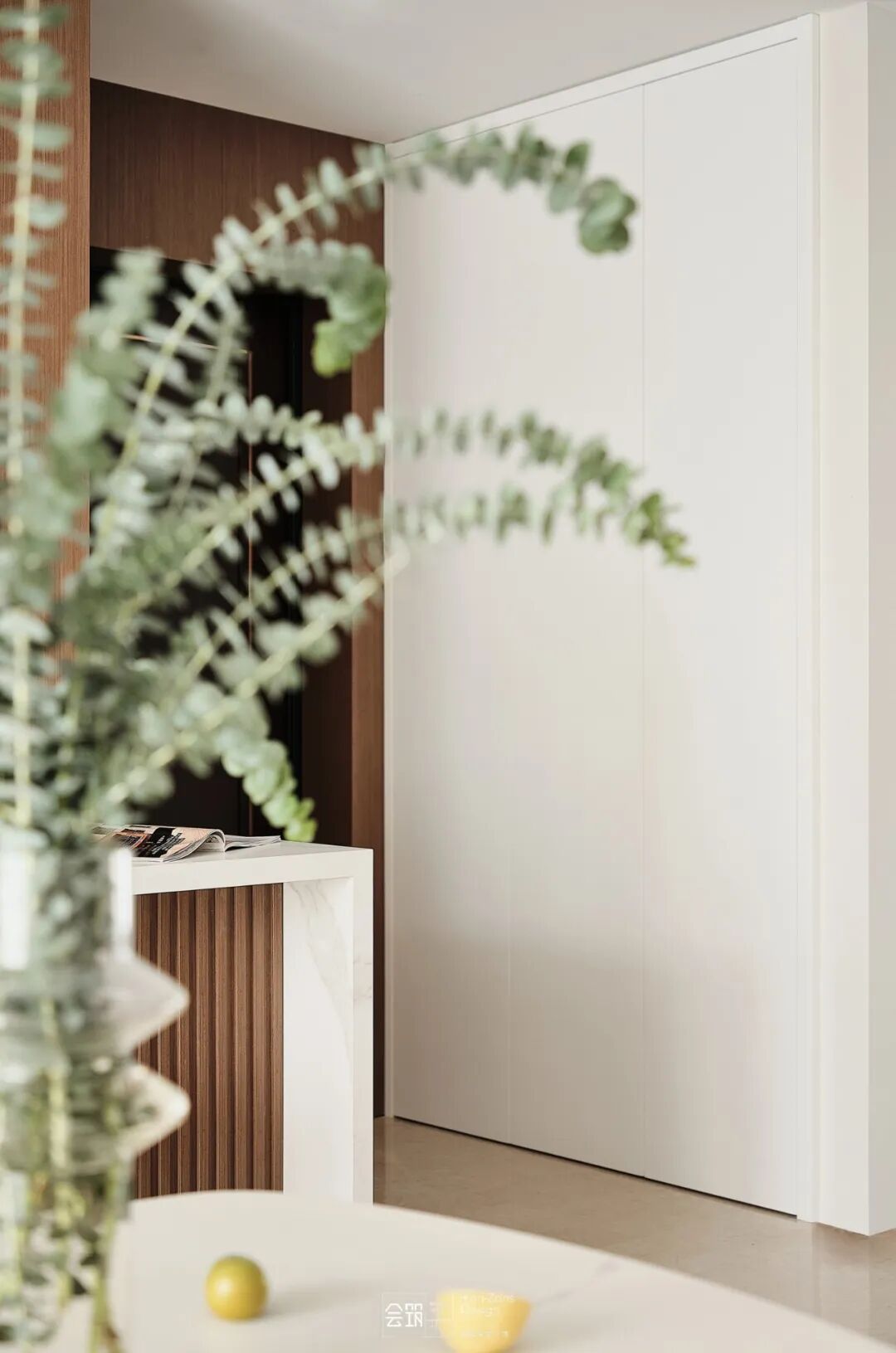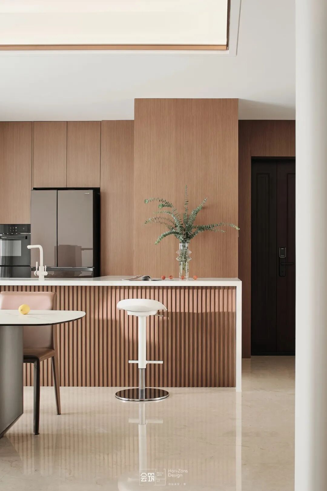 西厨区直纹的护墙饰面和柜门板,让整体风格更加简约时尚,原本的岛台台面拆除,以格栅板做外饰面,搭配一体式落地岩板简约且时尚,添上两个吧台椅,这里也可以作为家人交流区和简餐区。原本的入户鞋柜,调整为更加简洁的白色柜门,无把手的按压式柜门设计,门头护墙与吧台区统一,与整体现代简约的风格更加契合。