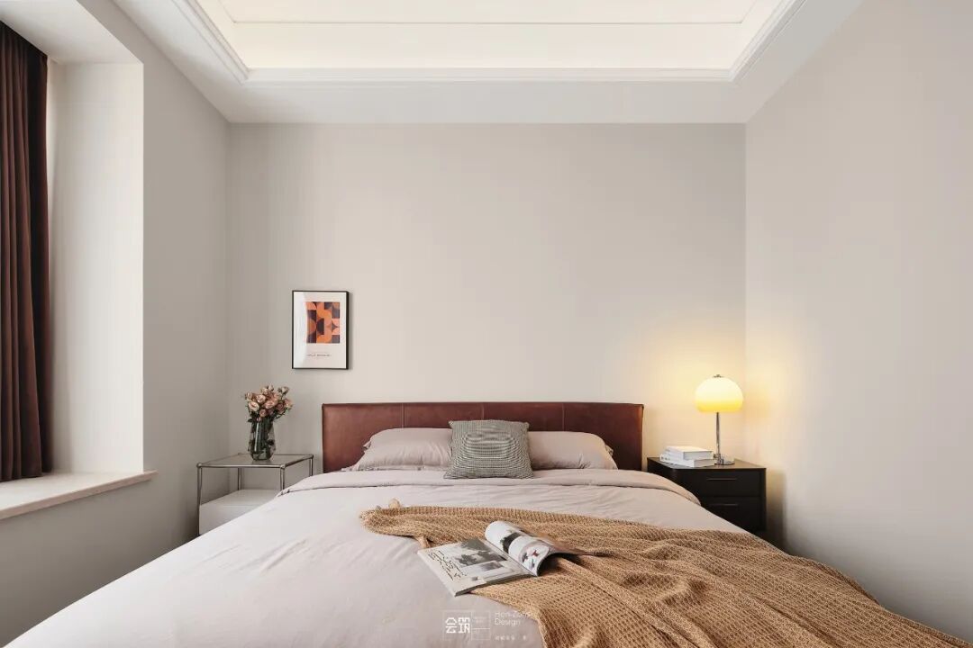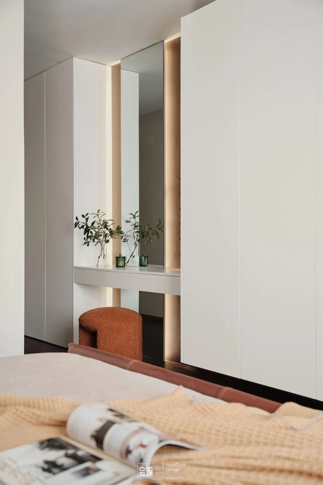 主卧室以大量的白色铺垫,赭褐色局部点缀,色彩上丰富有层次,整体简约中透着复古的精致感。进门处步入式衣帽间和整排衣柜,打造超强的收纳系统,悬挑的设计赋予空间轻盈感,中间融入女主心仪的梳妆台,通顶的梳妆镜又可以作为穿衣镜,既实用又有颜值,减少整排衣柜造成空间的拥堵感。