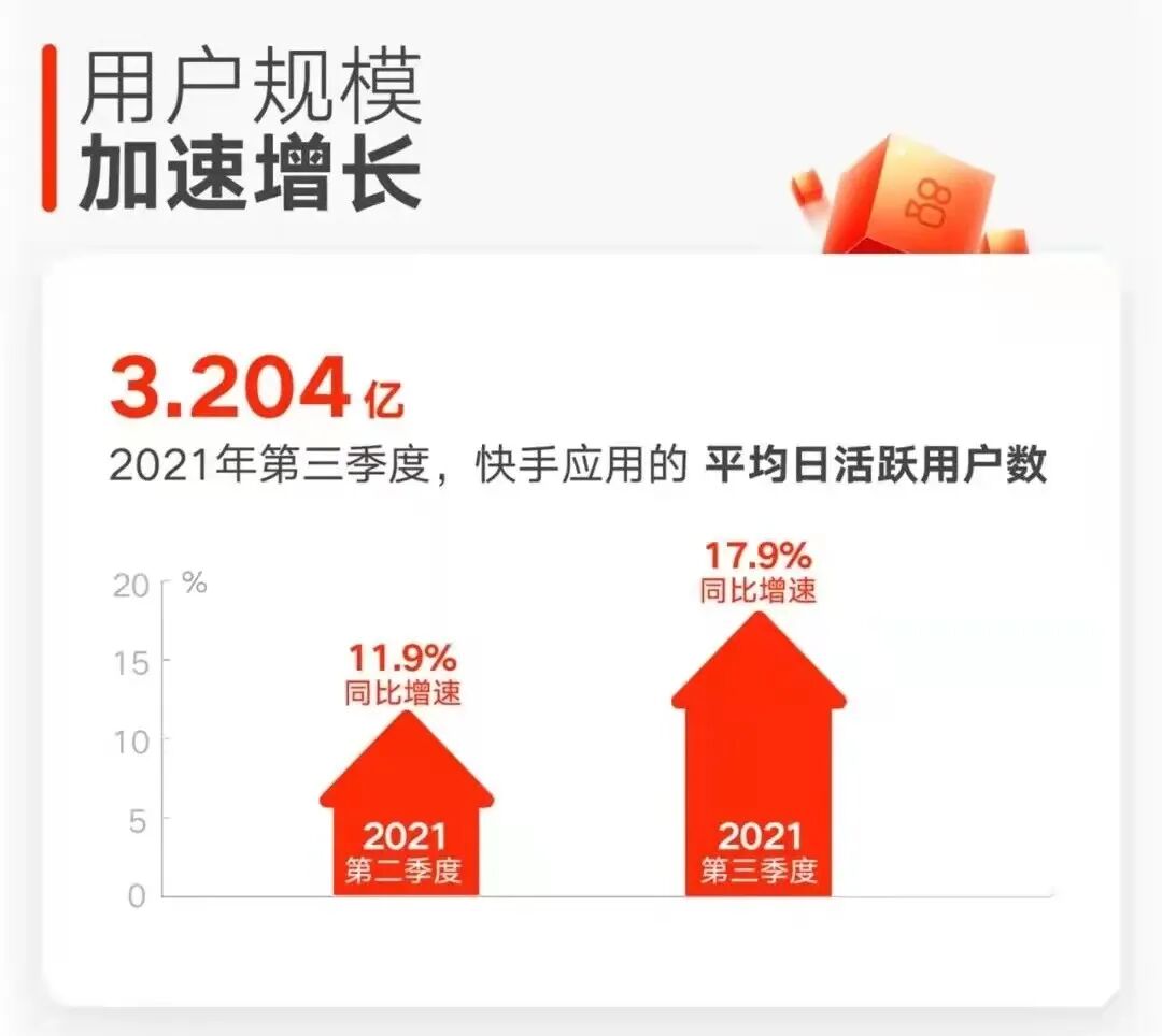 流量是一切广告业务的根基。上季度,快手的DAU(日活跃用户)达3.2亿,MAU(月活跃用户)达5.7亿,均创下历史新高;活跃用户平均时长从第二季度的107分钟提升至120分钟;日均流量同比增长60%。