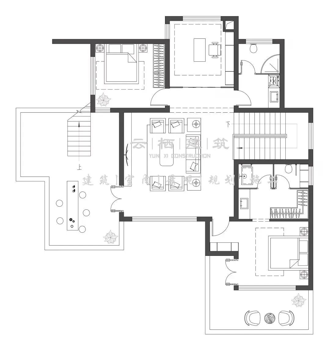 总共设计了5间卧室,二层做了套房设计,功能丰富,不仅配备了私卫,还单独设置了小的休闲区和办公区,同时门厅处的室外阳台也可使用。