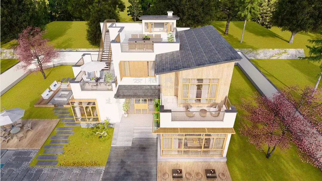 建筑的性质定位度假别墅,所以形体和功能布局跳脱出传统的家居布置,主体采用白色质感漆,搭配大面积的木饰板,给人干净、温暖质感。
