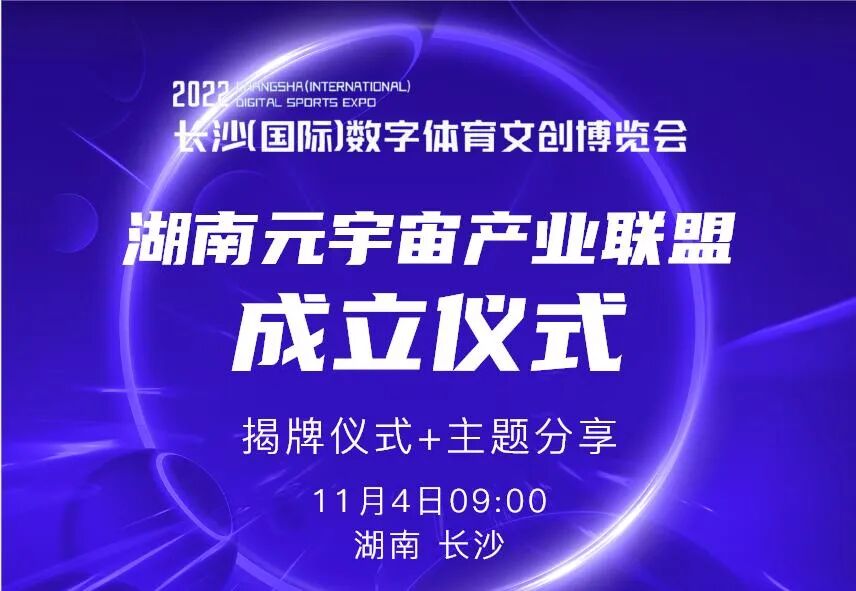 11月4日,长沙(国际)数字体育文创博览会期间,湖南元宇宙产业联盟发起成立仪式将在湖南国际会展中心(芒果馆)二楼F厅隆重举行。VR业内知名奖项第四届天鸽奖的颁奖盛典也将同期举行。