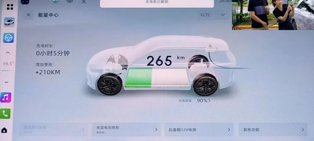 在发布会第二现场,小鹏官方还演示了新一代超快充的补能效率,以一辆G9为例,车辆初始续航里程为55公里,接入超充桩后开始充电,5分钟后,车辆续航里程达到了265公里,也就是说增加了210公里的续航里程,看来和官方宣传的“充电五分钟,续航200+km”基本一致。