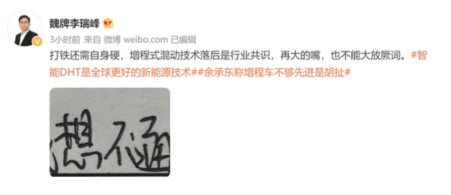 第二回合:在同样搭载增程式系统的AITO问界M7上市之初,自研DHT混动系统的长城WEY品牌CEO李瑞峰在公开场合直指增程式技术落后。和大众情况相同,搭载了长城DHT的WEY品牌车型销量并不见起色。原本希望通过领先的混动技术,带领WEY品牌走出困境的计划基本泡汤。
