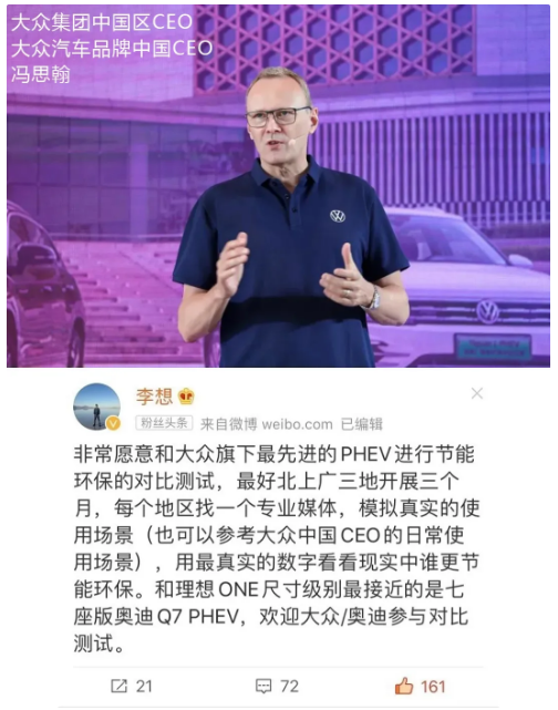第一回合:最早,大众中国CEO冯思瀚在公开场合直指增程式技术落后,彼时国内只有理想汽车一家采用增程式技术。搭载增程式系统的理想ONE最终也不负所望,在销量数据上一度力压大众多款国内中大型SUV销量之和,让理想掌门人李想有底气在微博上直接“炮轰”这位汽车同行。