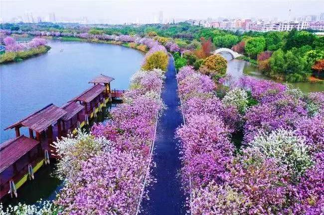 据了解,海珠湖公园的步道大致上是一个圆形。中间有一座小岛,岛上鸟儿聚集,鸟鸣声不断,有栈桥将步道和小岛相连。除了自然风光,这里还有漂亮的岭南建筑,星星点点地分布在步道两边。游客们最爱的就是在复古的建筑和宜人的自然风光中留影。