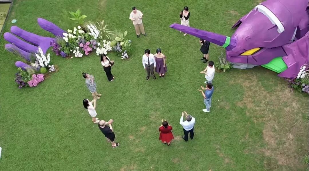在某书上,有博主分享了自己的EVA主题婚礼,男女主角不仅把请帖做成了电影海报的模样,甚至把初号机搬到了现场。友人们围了一圈鼓掌祝贺“哦咩嘚哆”,场景还原度拉满。