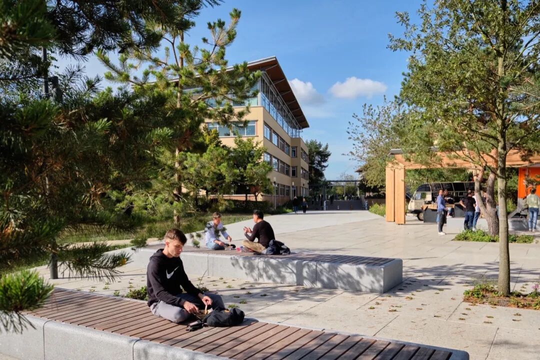 Above all, Homecourt is a meeting place for the community, old and young, sporty or not. The difference in height between the square and the east side of campus is bridged by an eye-catching staircase, which can be used as a seating area, stairs and skate spot.
