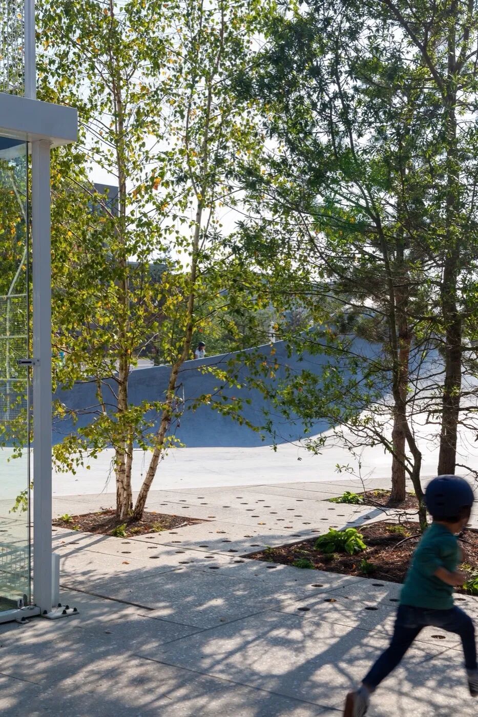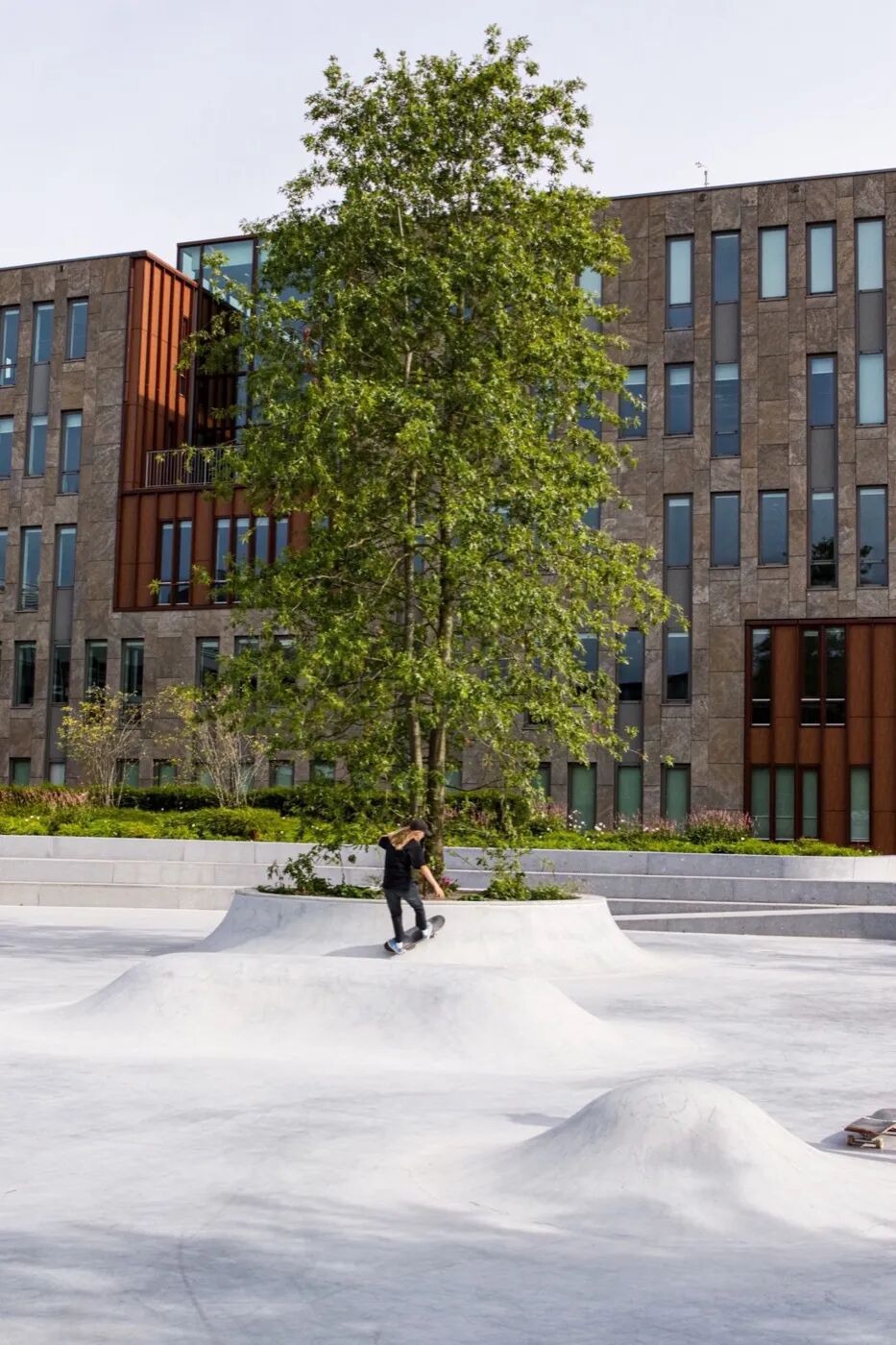广场被设计为混色区域中的森林从远处可以看到,但从里面看是隐蔽和宜人的。广场上有一个专用滑冰区一种抽象的波浪,它是主要的引人注目的地方。该广场还有快餐车空间。员工可以在这里享用下午的午餐,然后在树荫下享用。