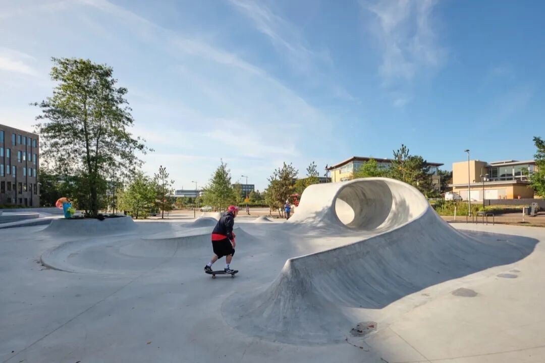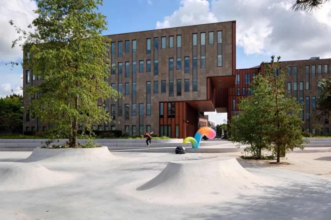 The square is designed as a forest in the heather fields- visible from afar, and sheltered and pleasant from the inside. In the square is a dedicated skate area an abstracted wave being the main eye-catcher. On the square, there is also space for food trucks. Here employees can get their lunch in the afternoon and eat it in the shade of the trees.