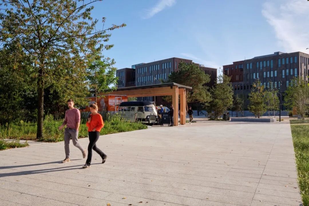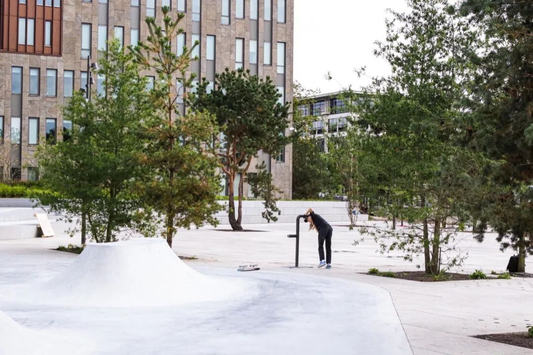 Homecourt is the first square that was completed as part of the new campus. The location originally was a bare and vacant lot on the campus that was characterized by the many backs of buildings and unclear routing. The design for Homecourt focuses on creating a new destination on campus with food and skate as the main activities.