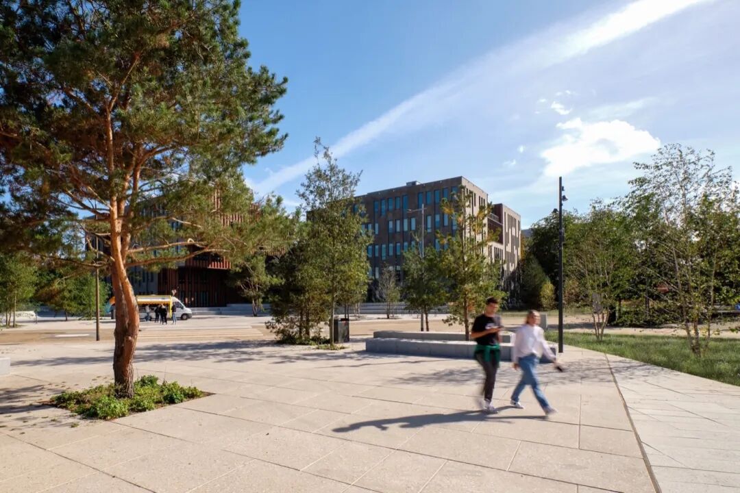 The biggest challenge of the location was that almost all the surrounding buildings turned with their backs to the site. Creating new borders by means of trees creates shelter and defines the place. The square has been cleared of car traffic. the future boulevard and the square will be car-free. The entrance to the facility area has also been relocated and fully integrated into the square. This gives pedestrians plenty of space on the new square, which has become a high-quality meeting spot for the users of campus as well as for the local community.