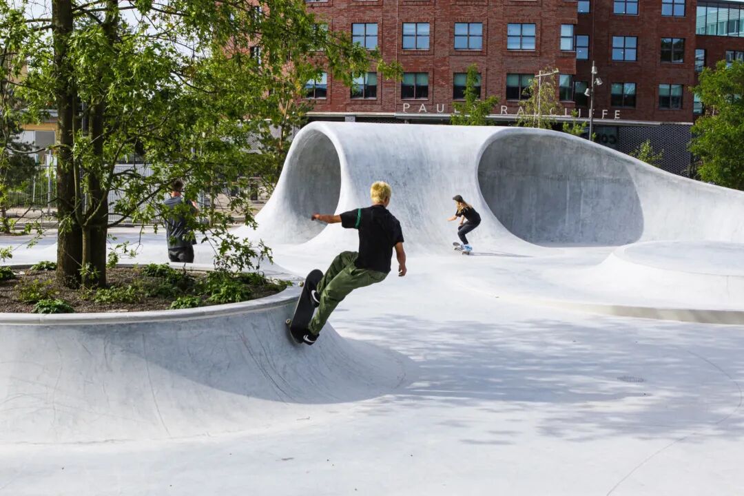 All objects and materials on the square are designed in such a way that they can be skated optimally. The large format tiles are unique in size and composition; the colour and pebbles give a sandy look to the square, matching the geology of the area. More than 90 trees have been planted in and around Homecourt in various types and ,sizes. The trees are planted close together so that they can grow as groups. two pine trees and a Quercus palustris located in the heart of the skate area act as eye-catchers on the square.