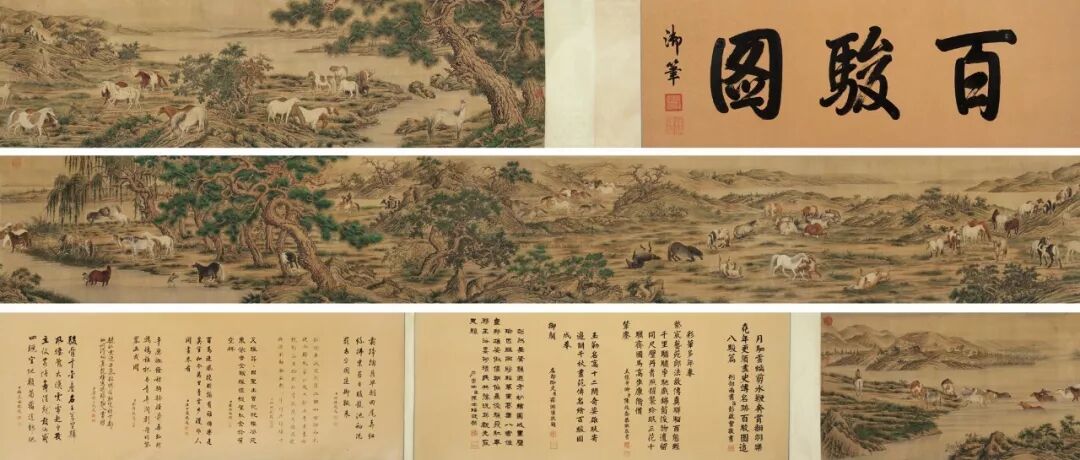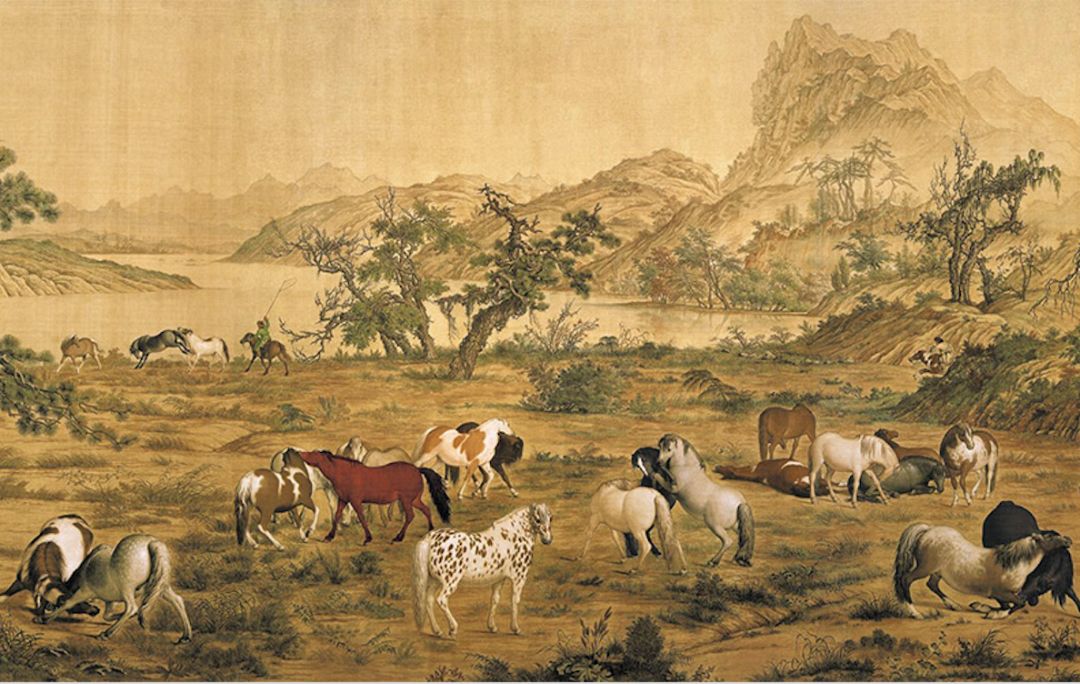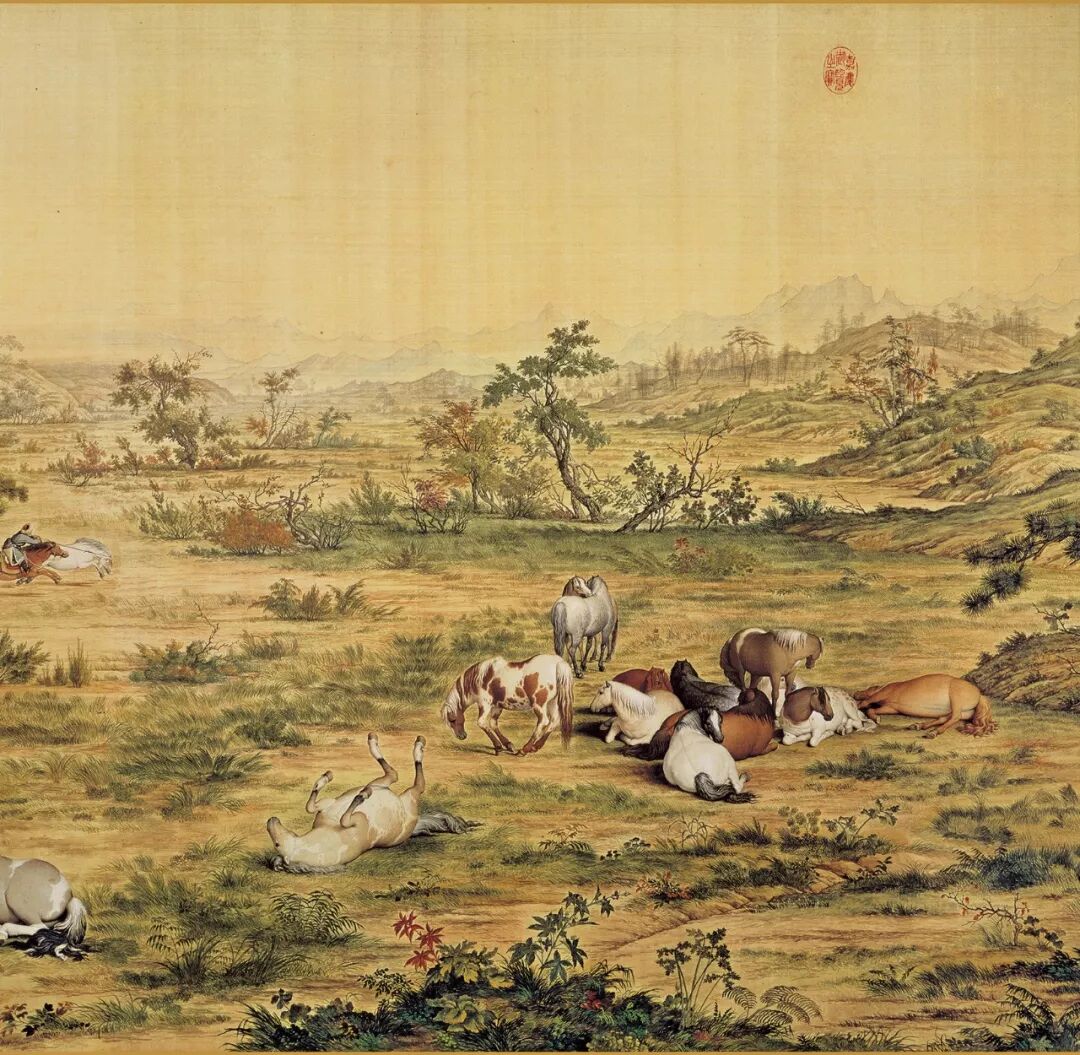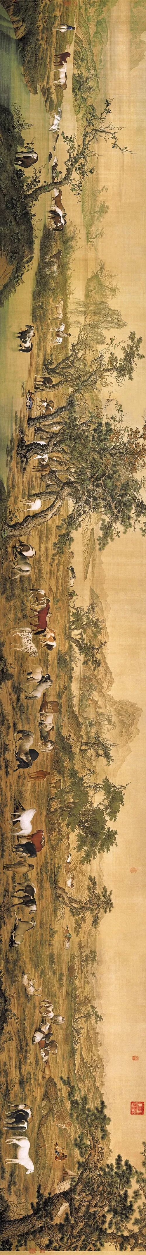郎世宁善画马,《百骏图》是其平生百余作品中的杰作。描绘姿态各异的骏马百匹,放牧游息的场面。马匹们或卧或立、或嬉戏、或觅食,自由舒闲,聚散不一。