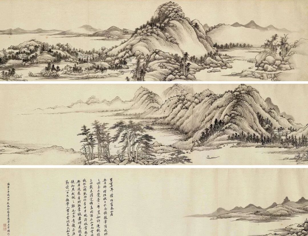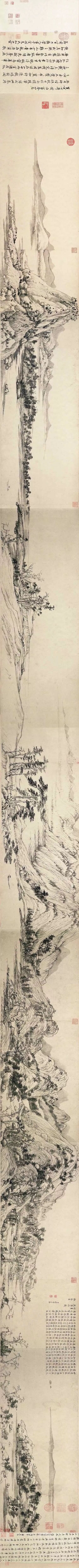 《富春山居图》由六张纸接裱而成,约七百公分的长卷形式,描绘了富春江两岸初秋的秀丽景色。
