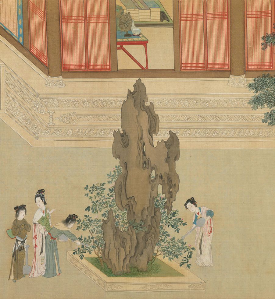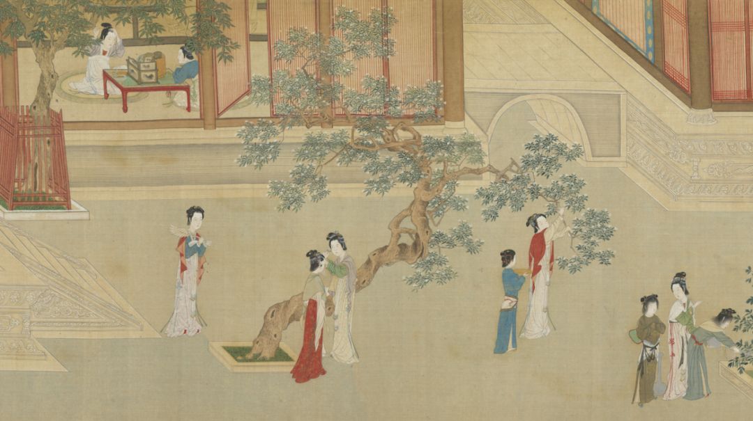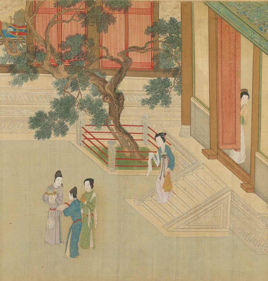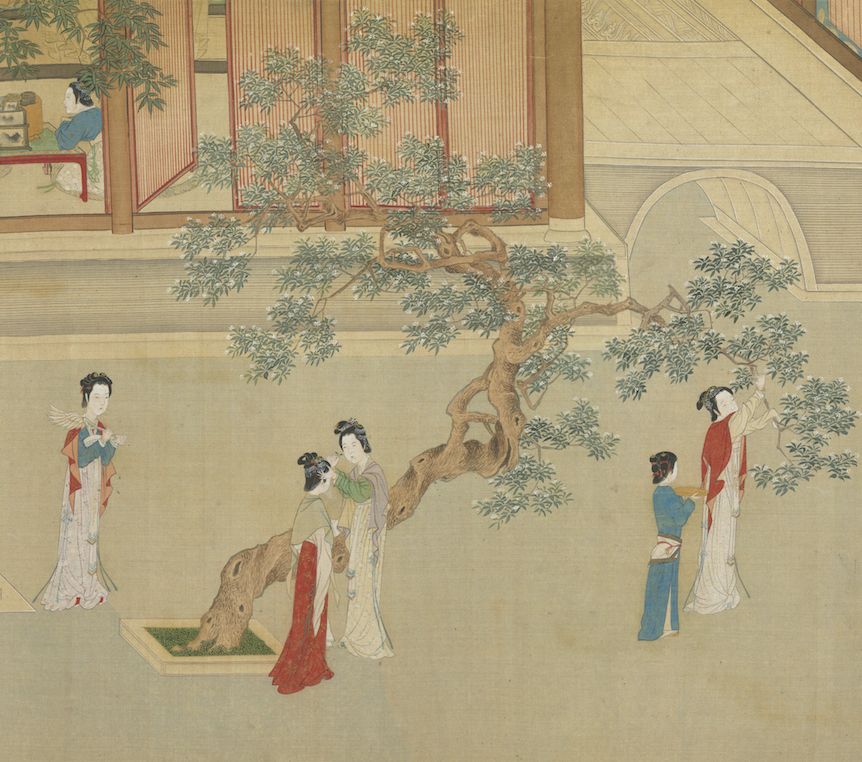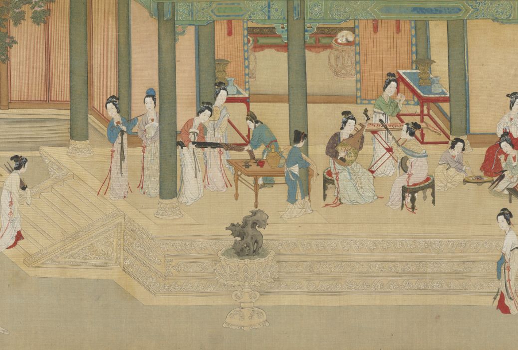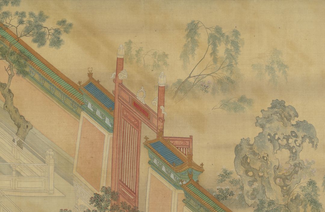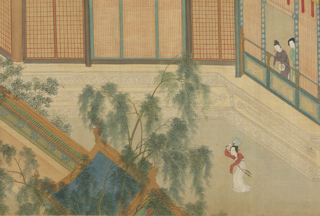 审美观念上,仇英将主观意趣与自然之境相结合。高台楼阁、绿树丛林、潺潺流水、鸟语花香,渲染出娴雅幽然的境界,以及宫廷生活的浮华与绚烂。