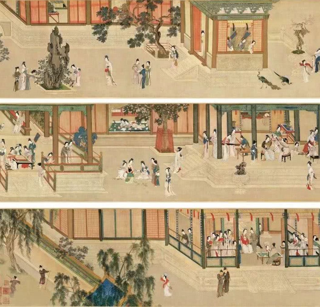 除美女群像外,林木奇石与华丽宫阙穿插掩映,更融入琴棋书画、鉴古、莳花等文人雅兴。勾勒秀劲而赋色妍雅,铺陈出宛如仙境的瑰丽景象。