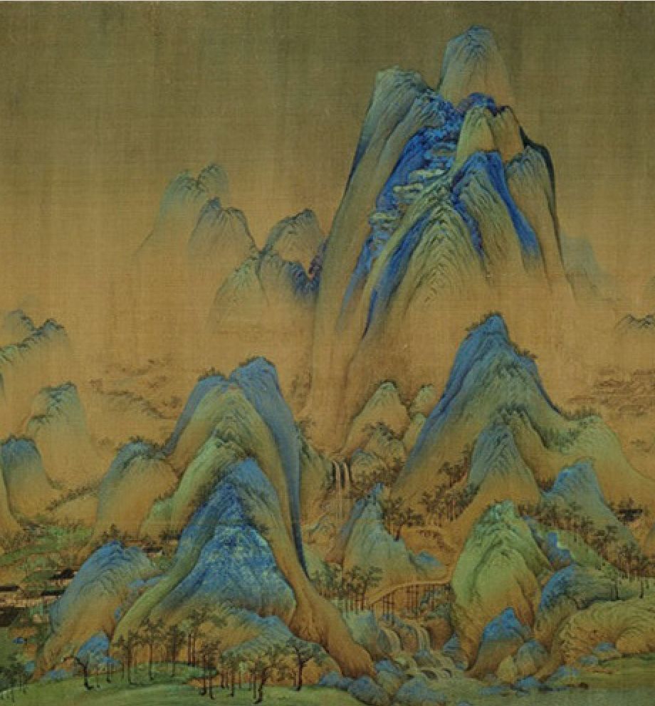《千里江山图》全面继承了隋唐以来,青绿山水的表现手法。山石皴法以披麻与斧劈相结合,综合了南、北两派的特长。又于单纯中求变化,丰富了视觉表现力。