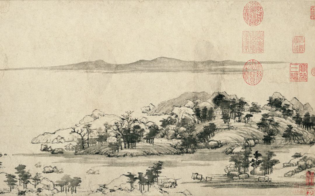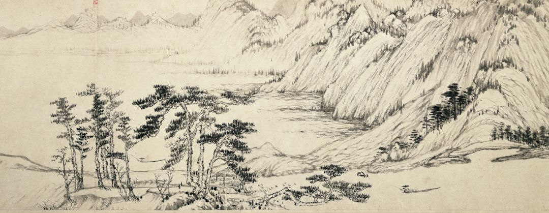 第三段节奏渐趋平缓,岛下平铺渔村,舟帆点点,起承接作用。卷左下部画近景坡岸与之相连接,突起的秀峰其势向上伸过江面和远山,结住开起之势,总结全卷。