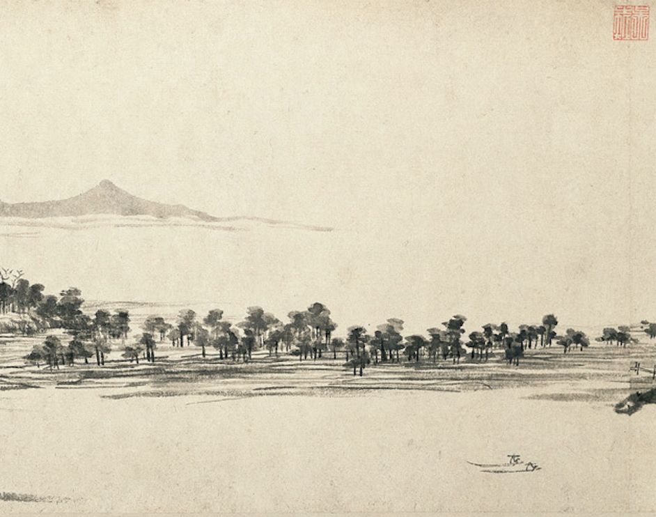 第二部分至第三部分墨色空间变化最丰富,画笔突转,皴染的山坡与平静的江面延伸,疏离秀丽,浓墨细笔勾勒水波丝草,阔水细沙,风景灵动。